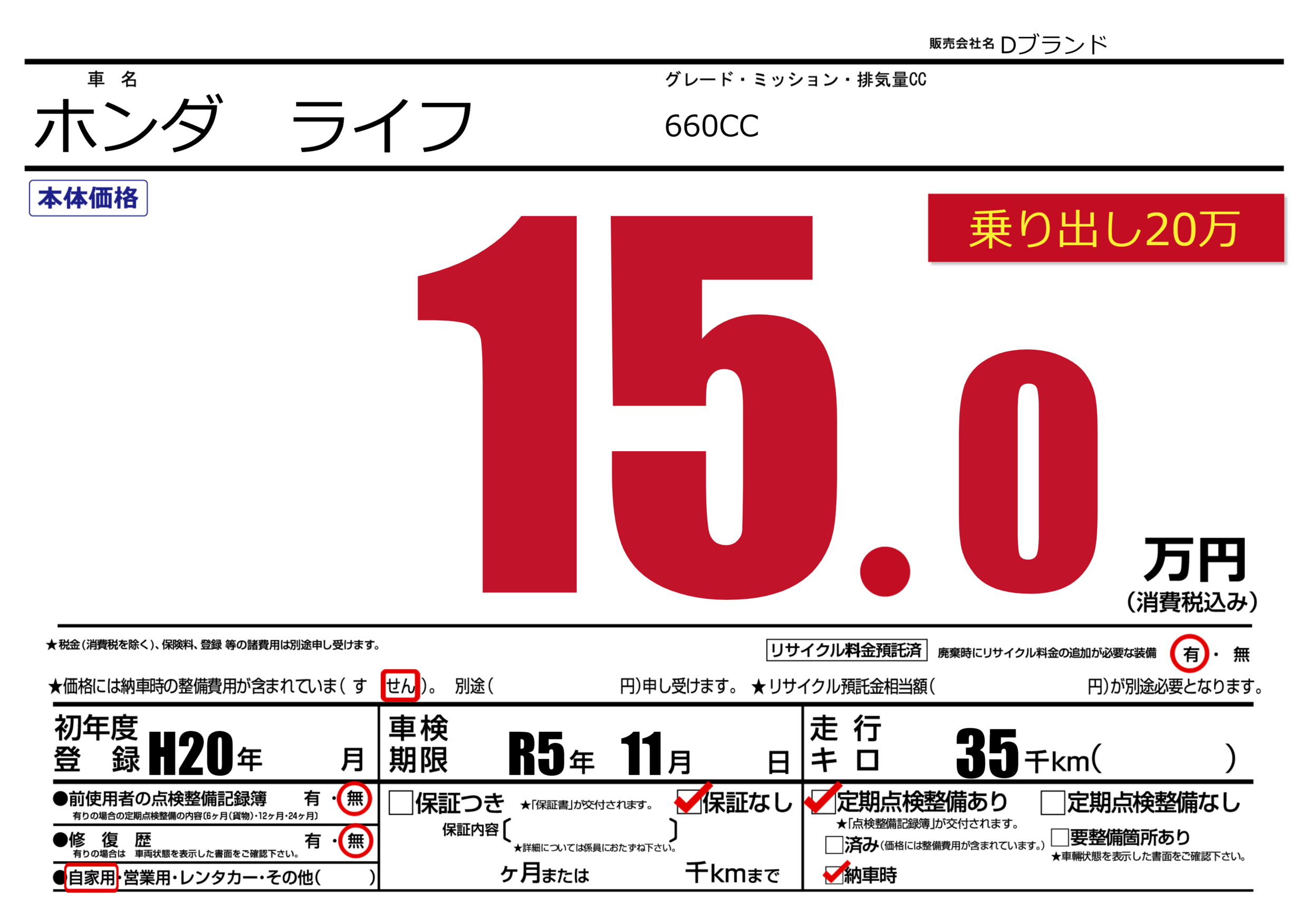| 車名 | ホンダ ライフ | グレード ミッション 排気量 |