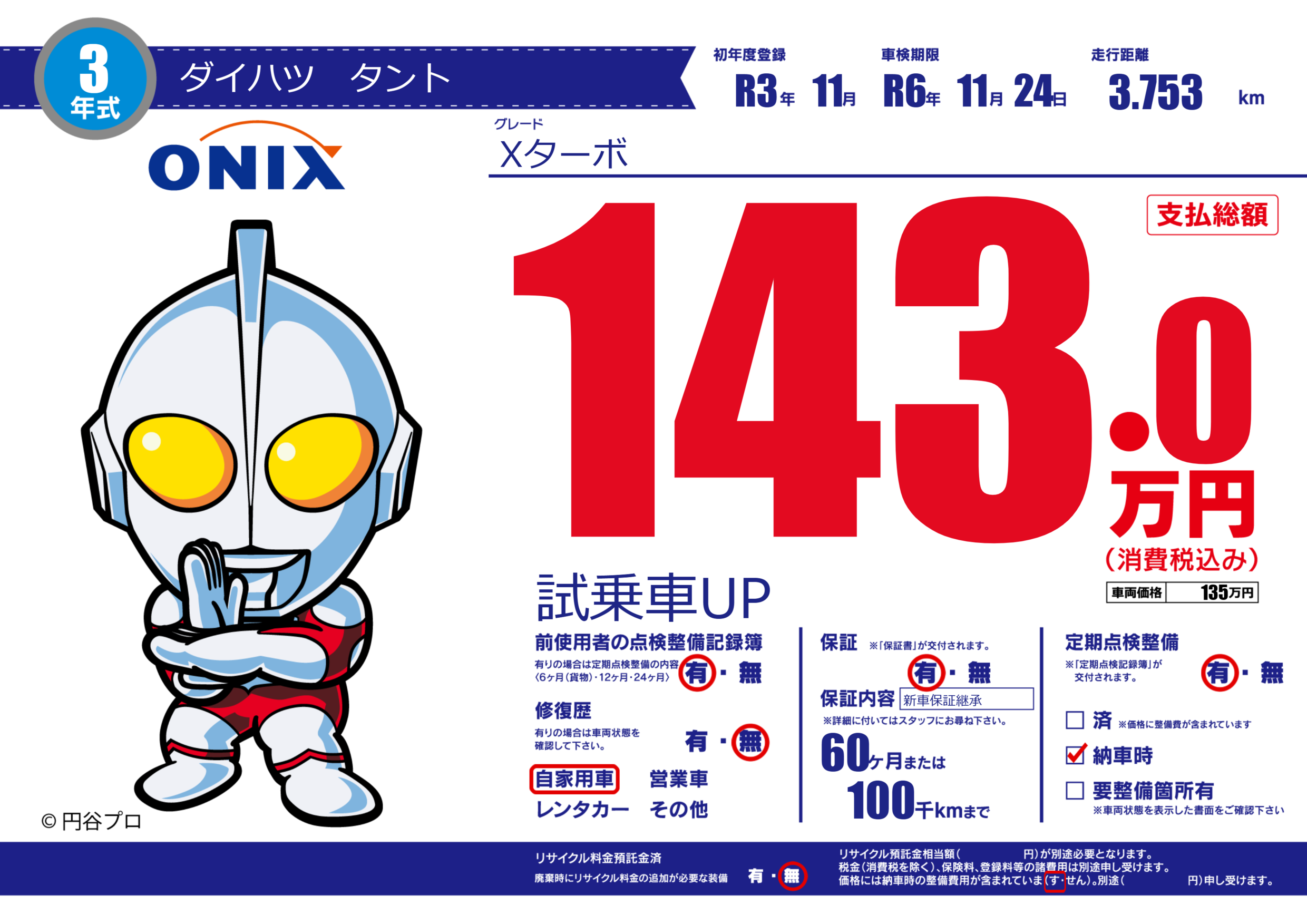 | 走行キロ | 0.3万km | 初年度登録 | R3年11月 |