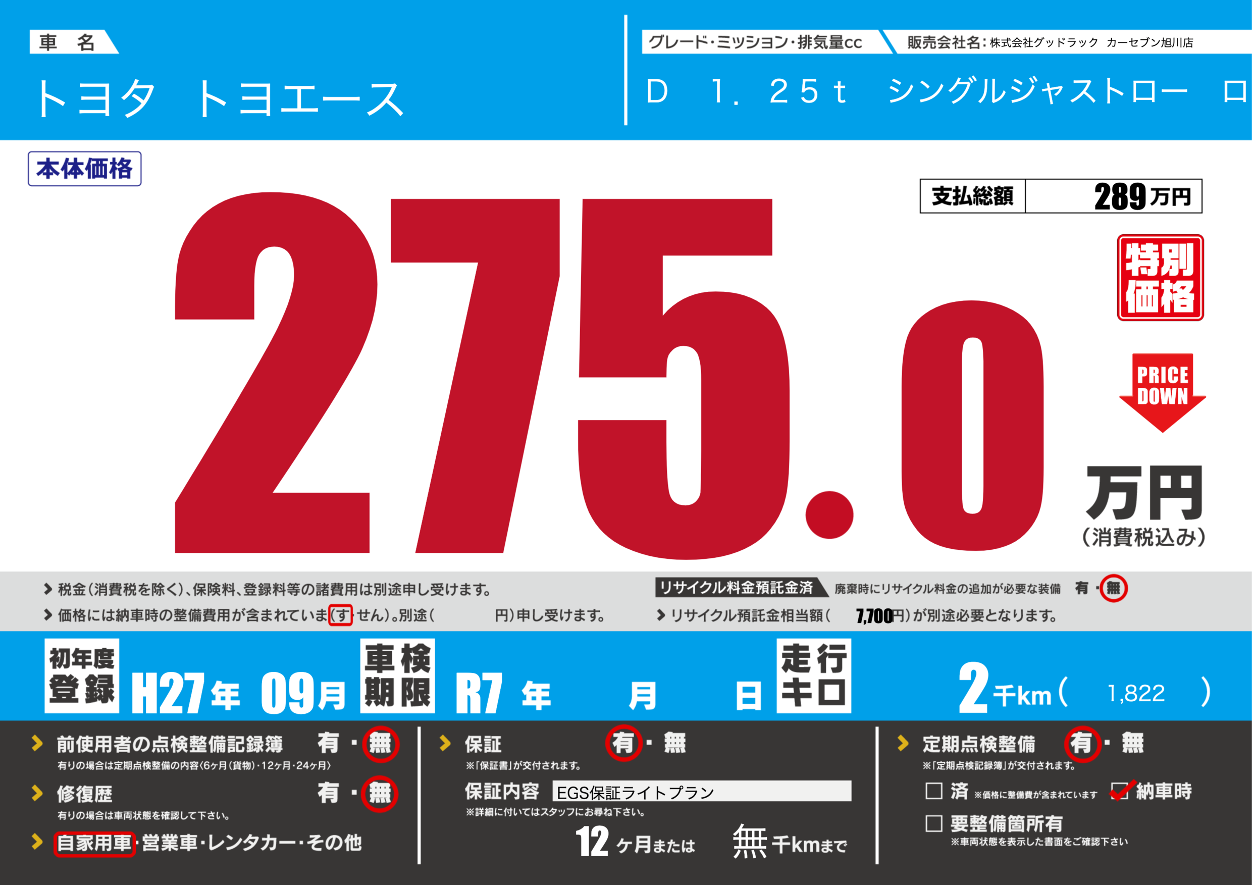 | 走行キロ | 0.2万km | 初年度登録 | H27年09月 |