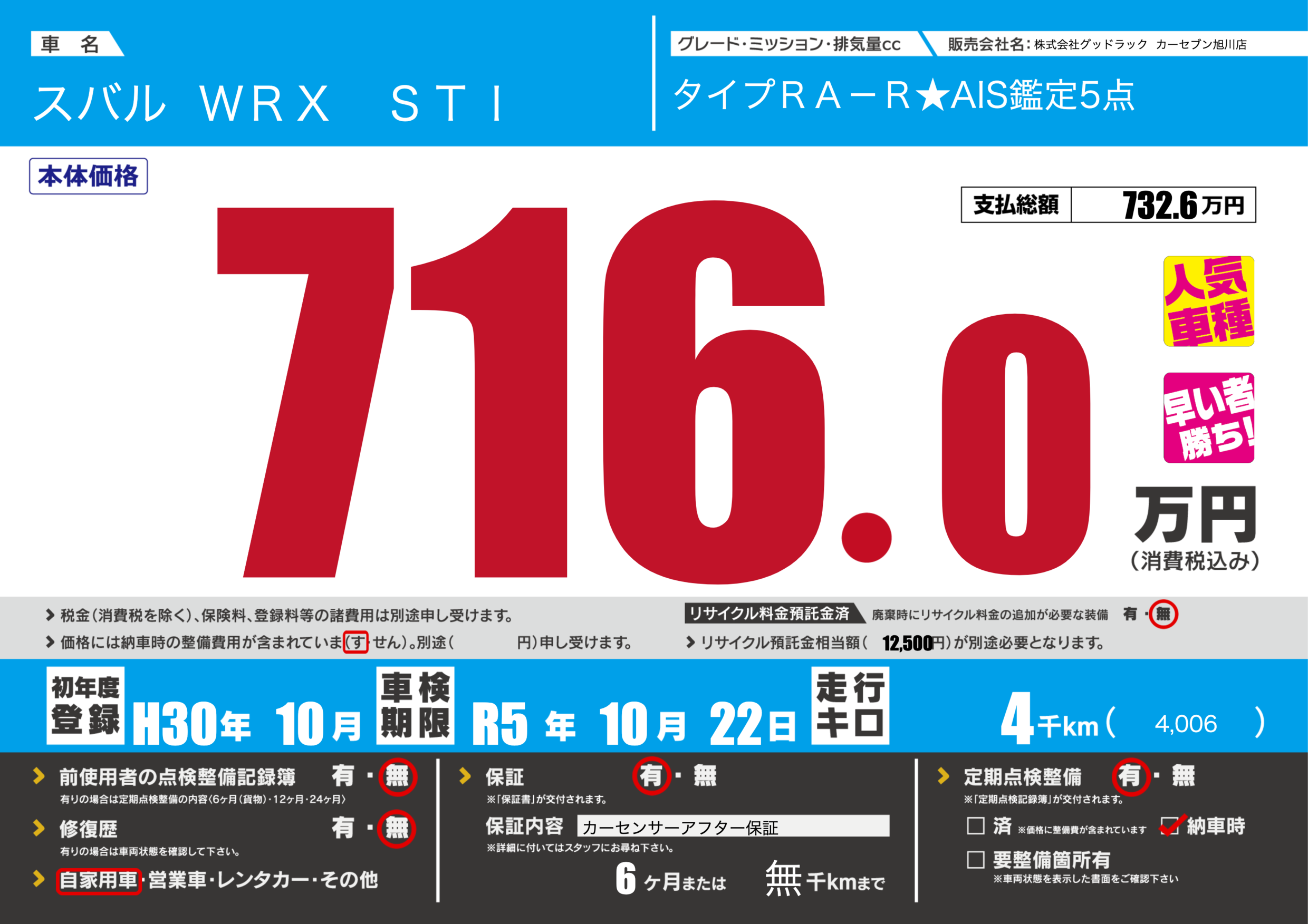 | 車名 | スバル WRX STI | グレード ミッション 排気量 |