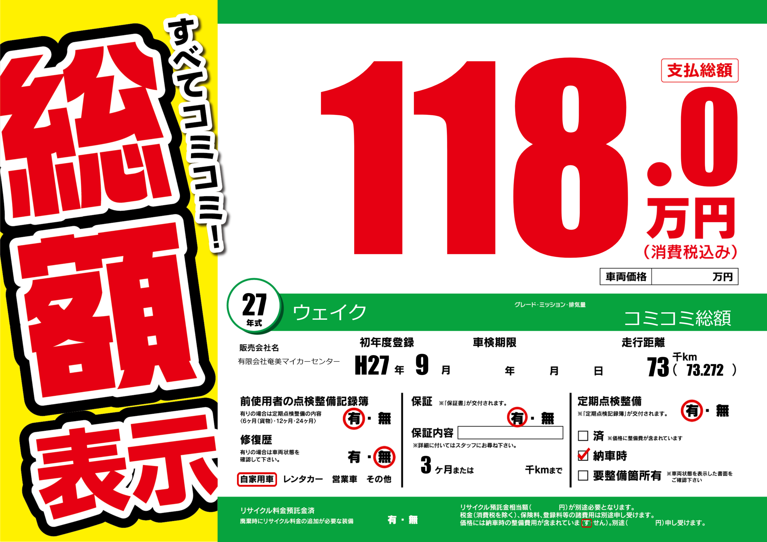 | 定期点検整備 | 定期点検整備あり 納車時あり | ||