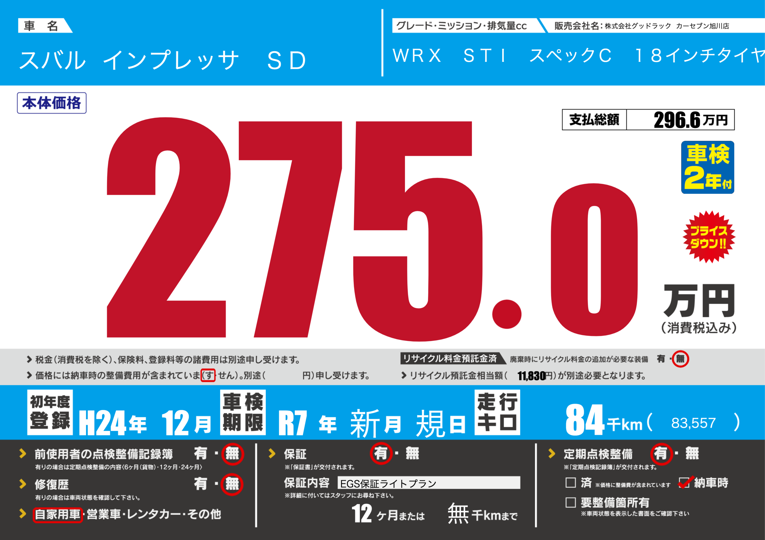 | 車名 | スバル インプレッサ SD | グレード ミッション 排気量 |