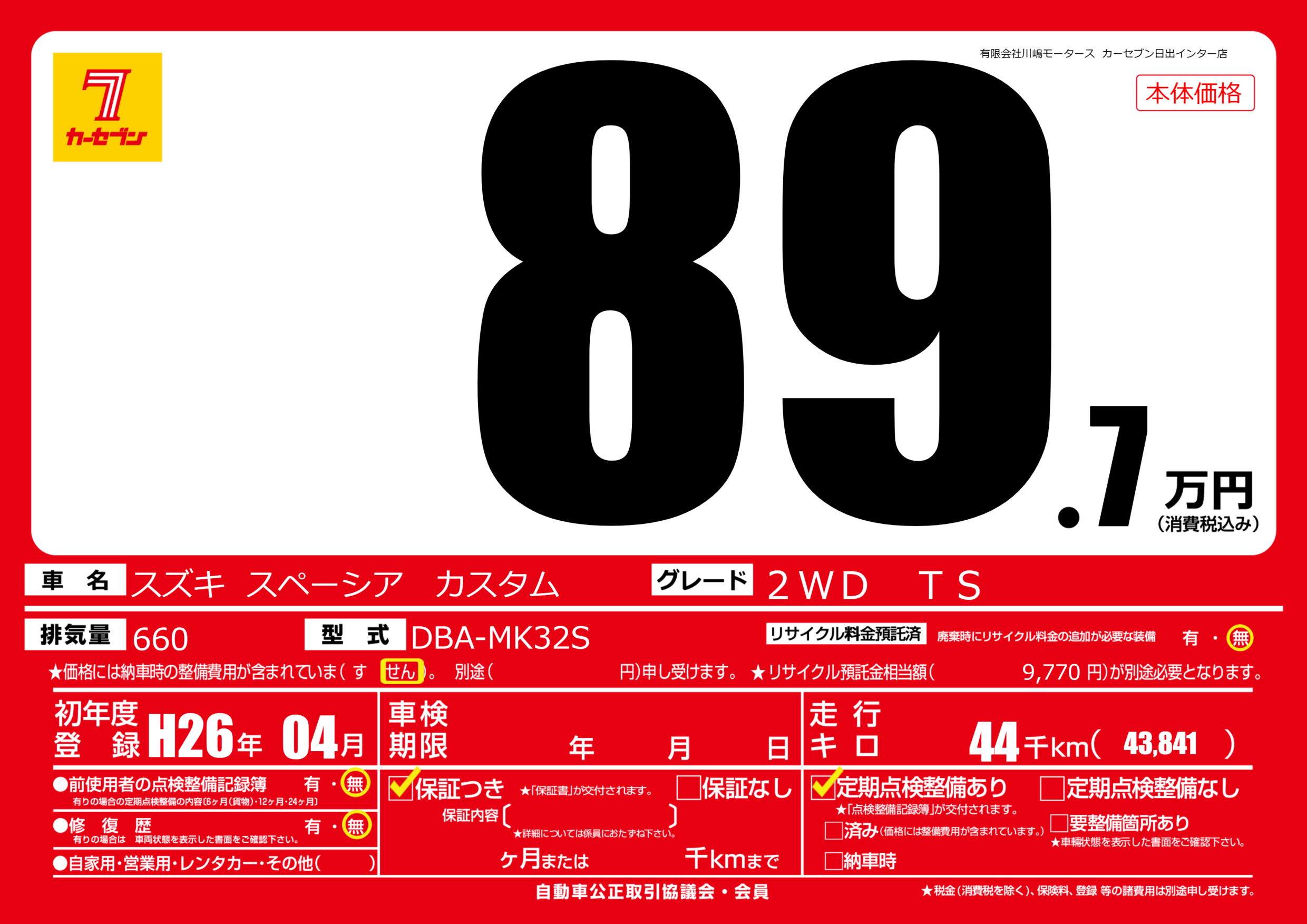 | 車名 | スズキ スペーシア カスタム | グレード ミッション 排気量 |