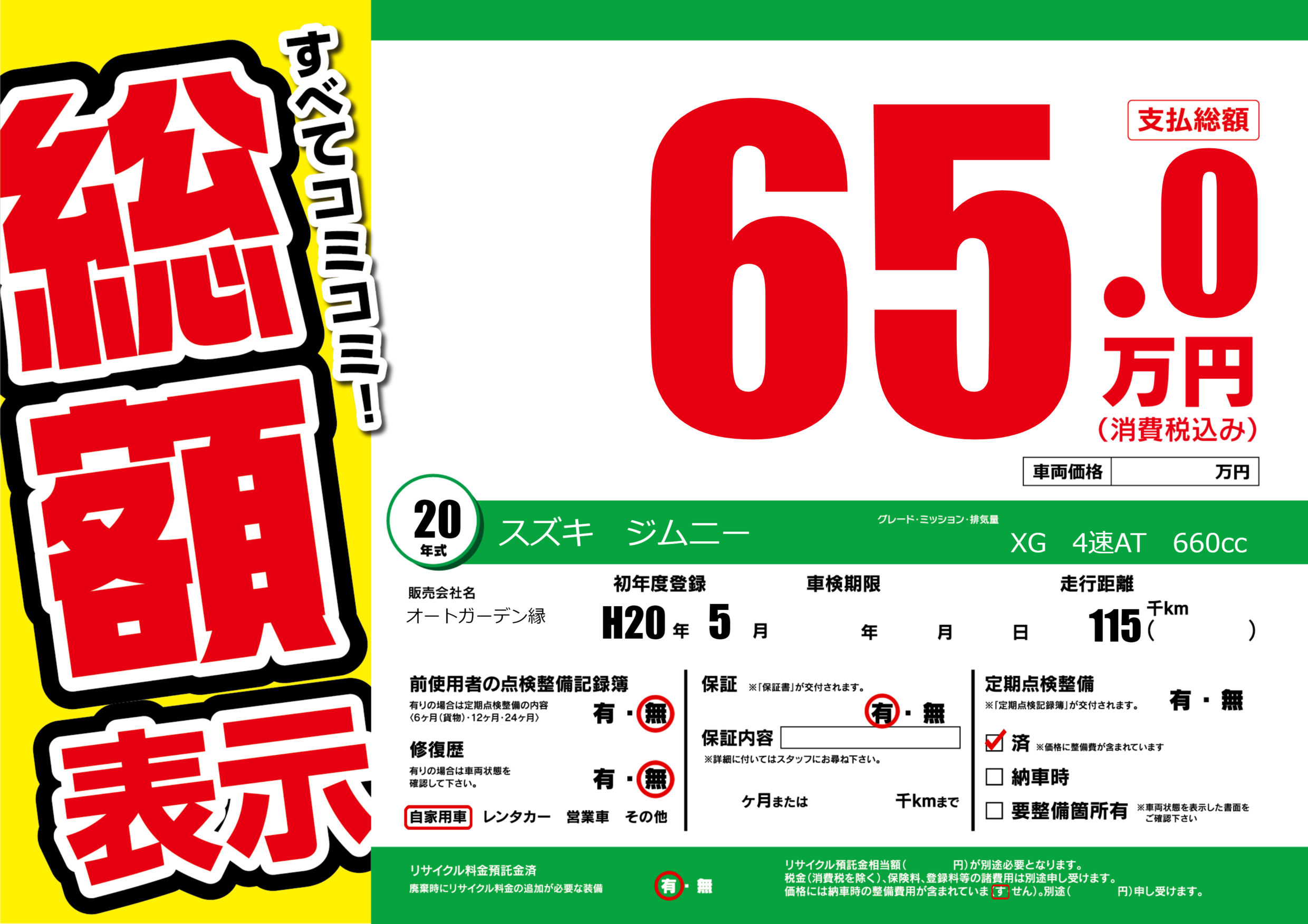 | 車名 | スズキ ジムニー | グレード ミッション 排気量 |