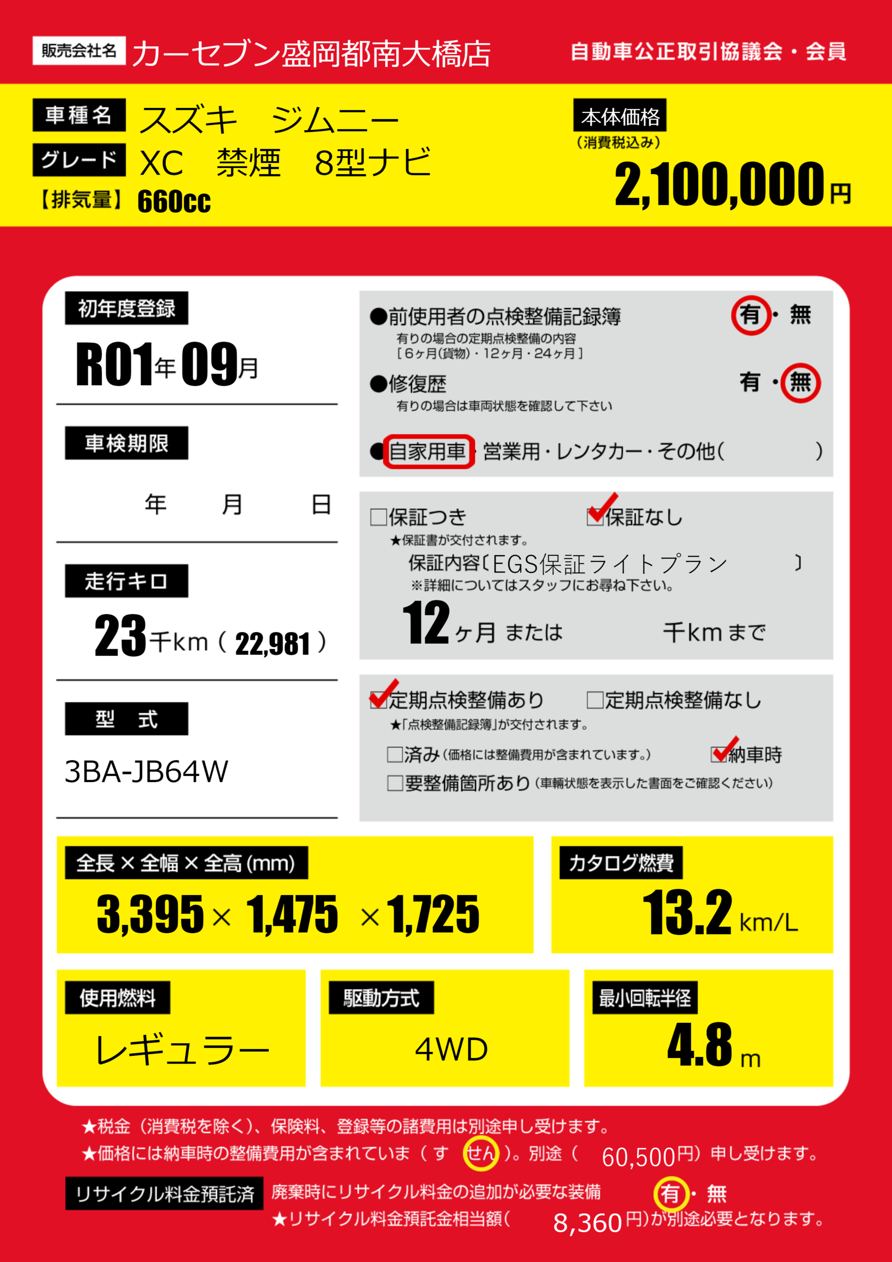 | 車名 | スズキ ジムニー | グレード ミッション 排気量 |