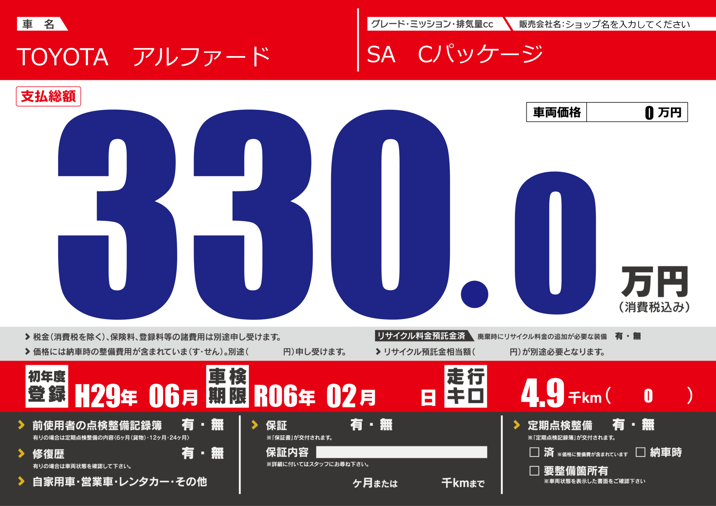 | 車名 | TOYOTA アルファード | グレード ミッション 排気量 |