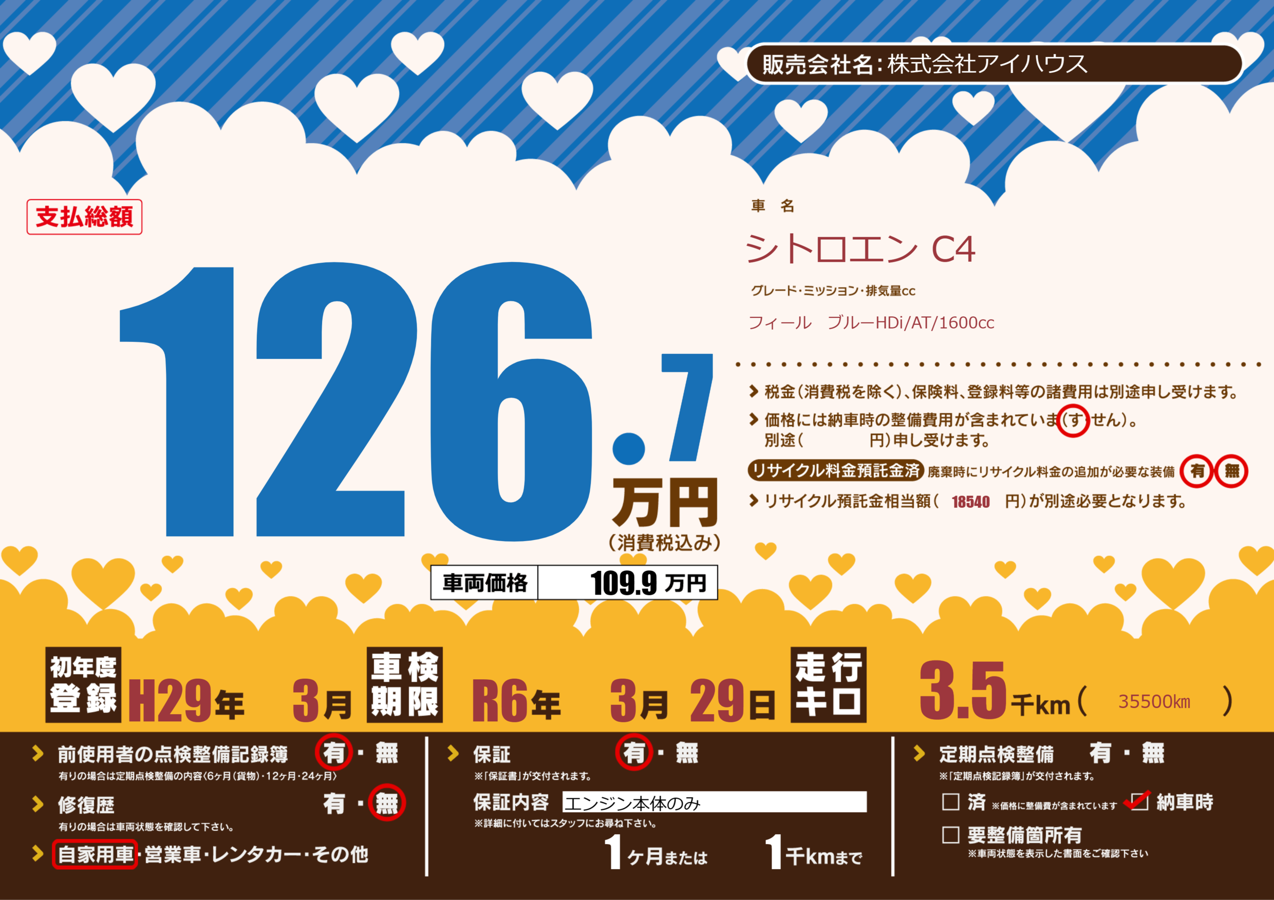| 車名 | シトロエン C4 | グレード ミッション 排気量 |