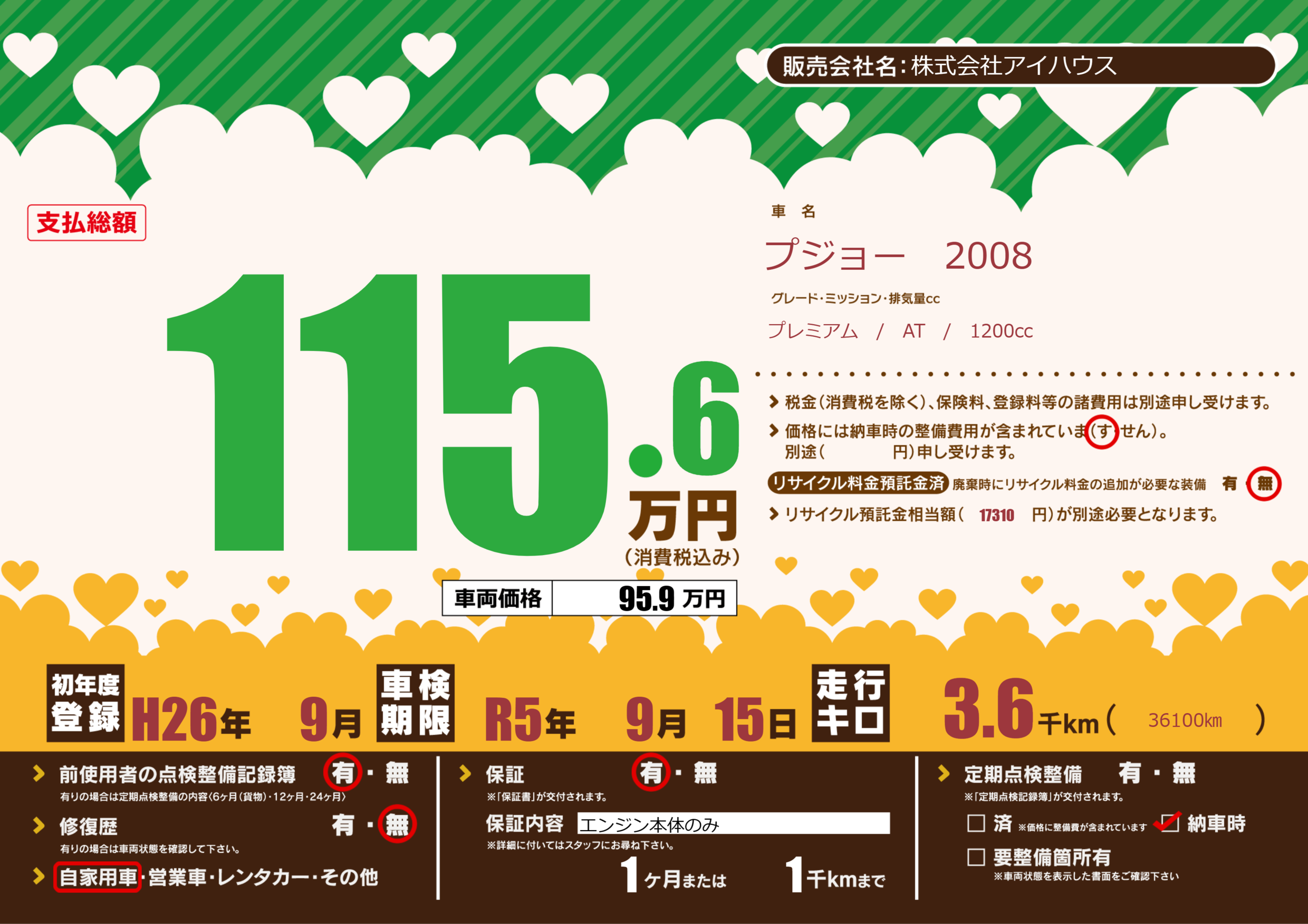 | 車名 | プジョー 2008 | グレード ミッション 排気量 |