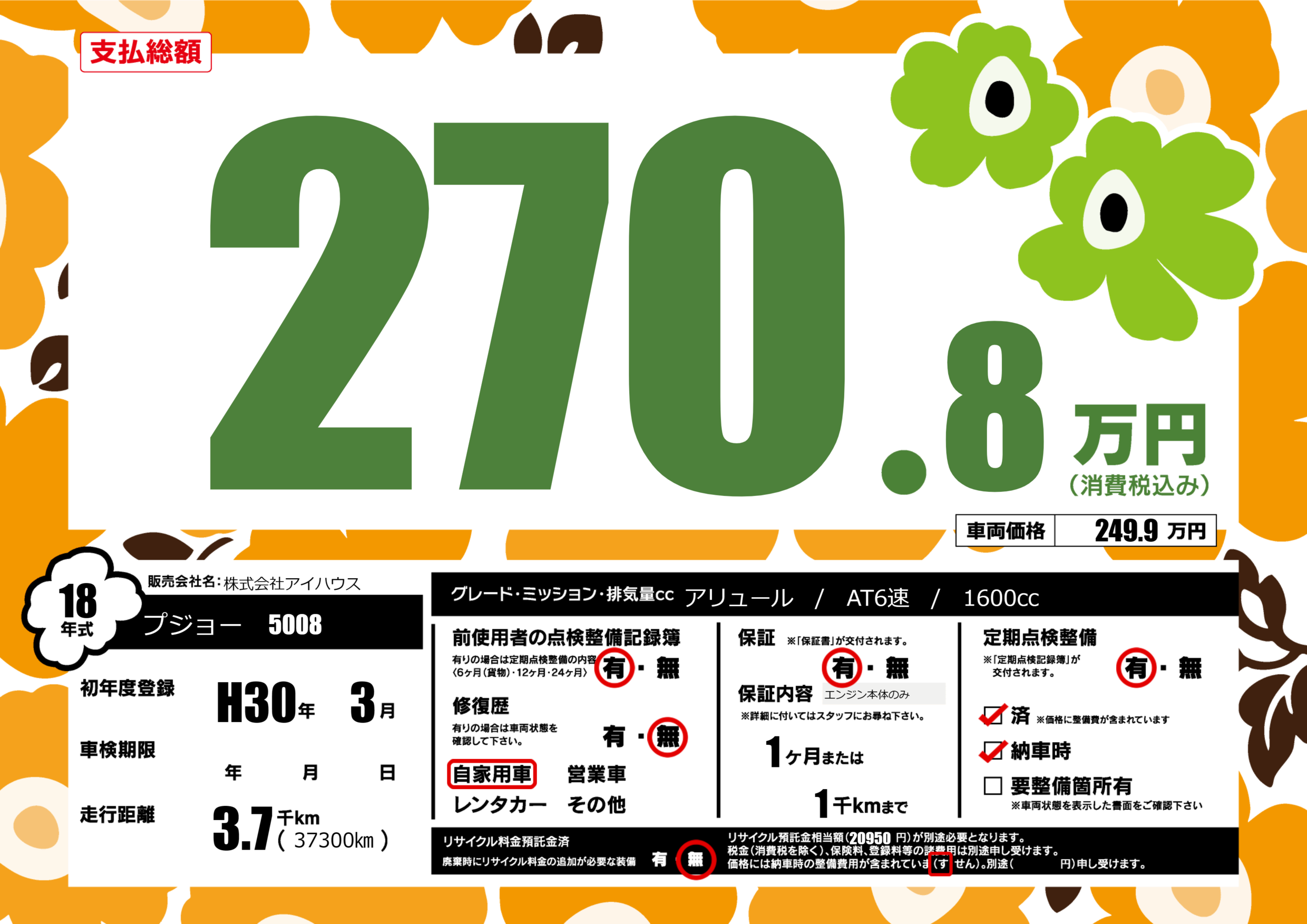 | 車名 | プジョー 5008 | グレード ミッション 排気量 |