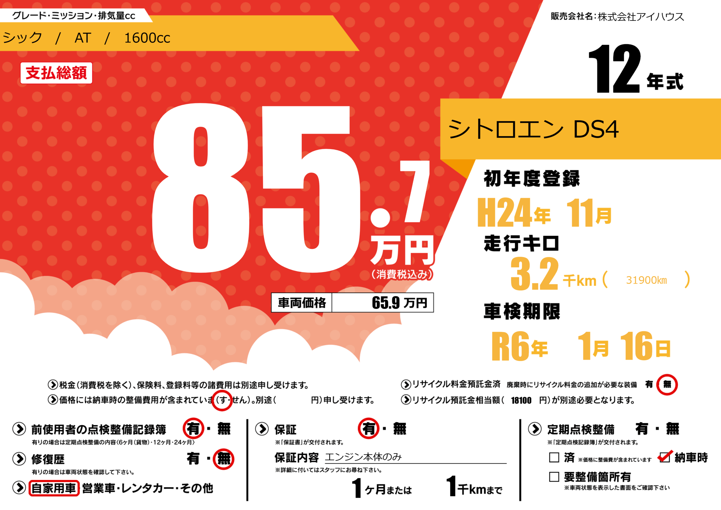 | 車名 | シトロエン DS4 | グレード ミッション 排気量 |