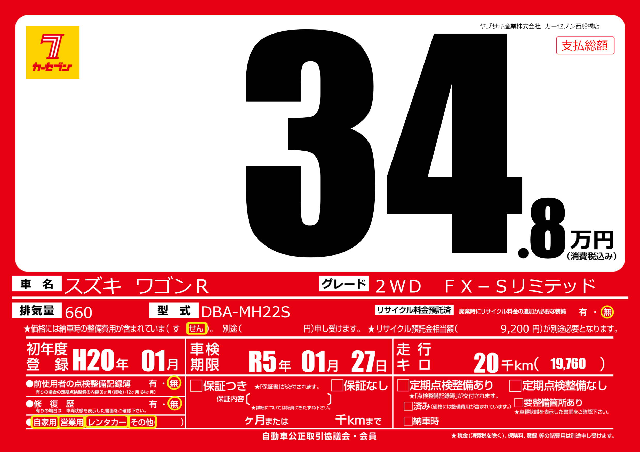 | 走行キロ | 2万km | 初年度登録 | H20年01月 |