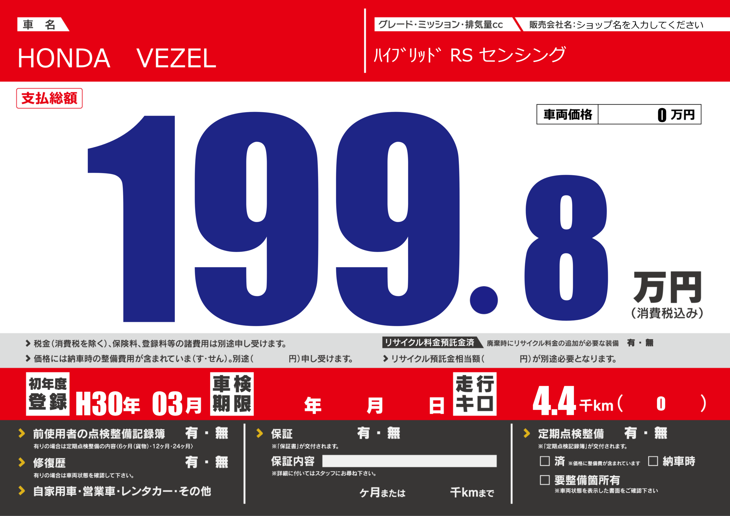| 車名 | HONDA VEZEL | グレード ミッション 排気量 |