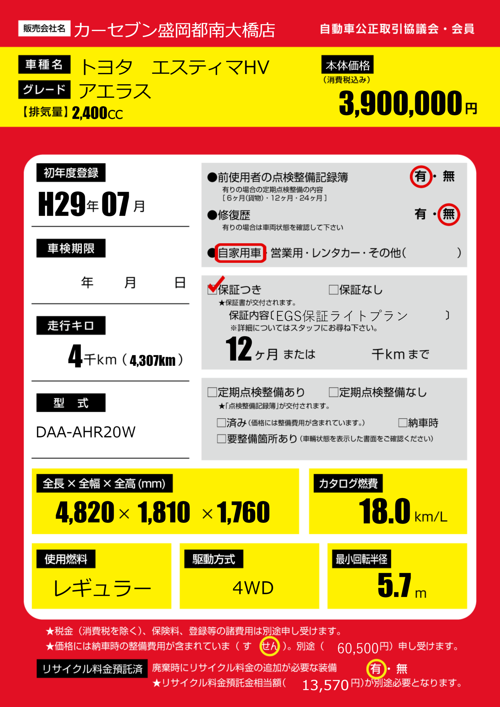 | 車名 | トヨタ エスティマHV | グレード ミッション 排気量 |