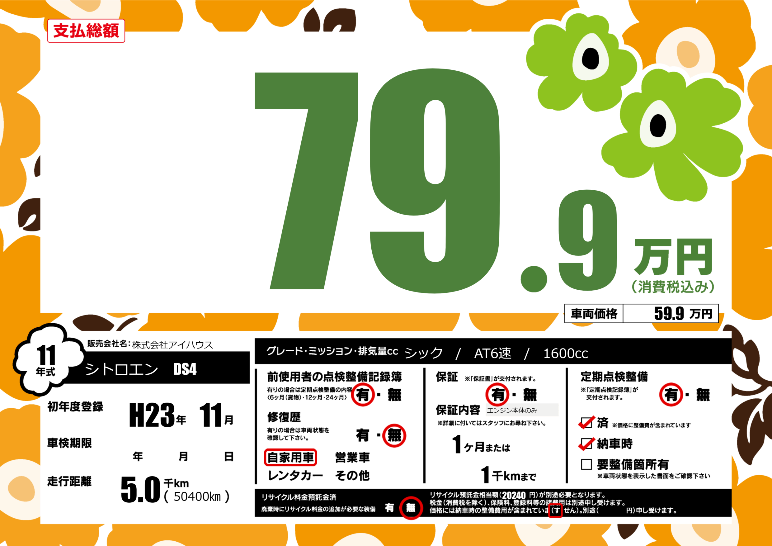 | 車名 | シトロエン DS4 | グレード ミッション 排気量 |