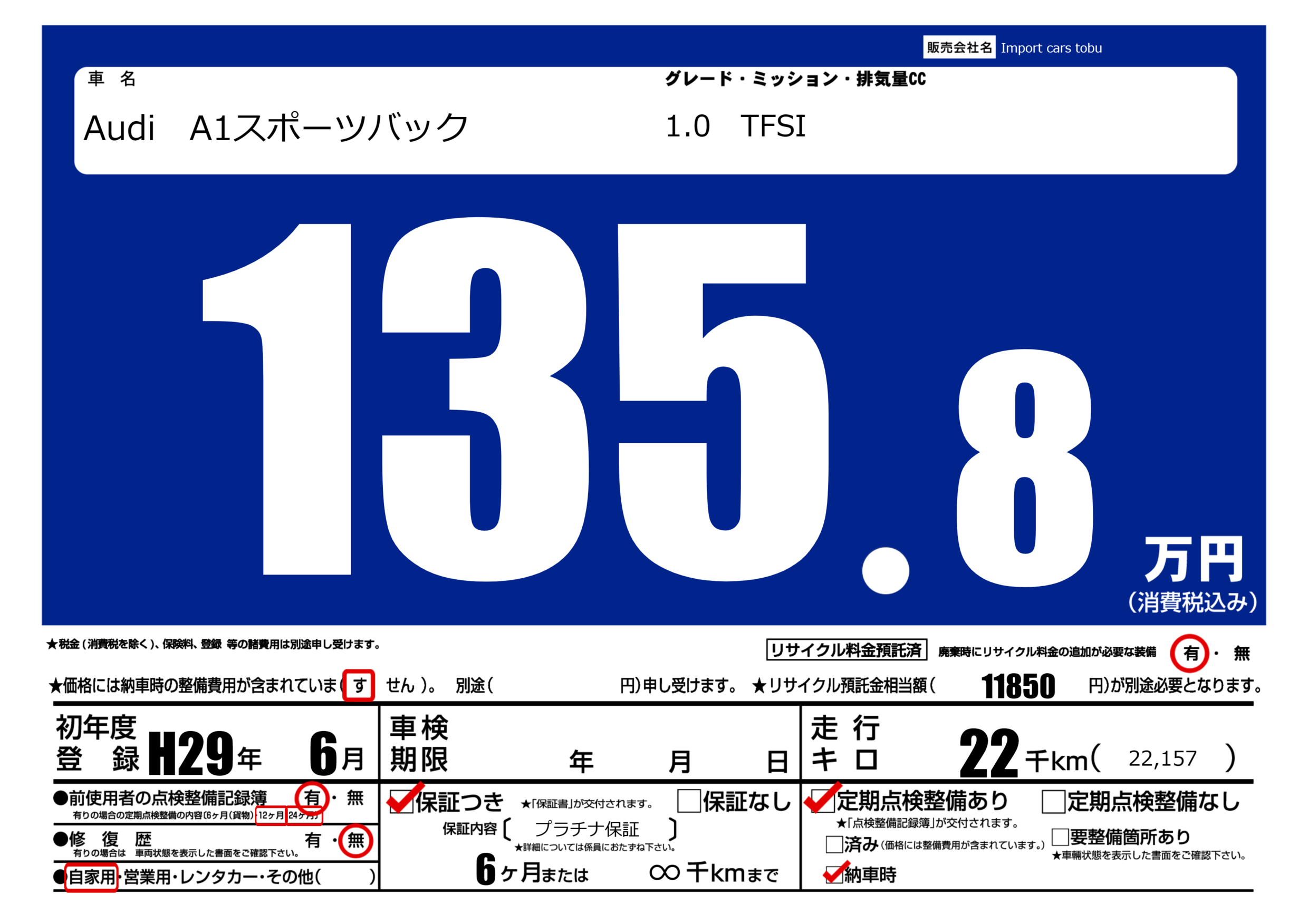 保証付き 保証内容( プラチナ保証) 6ヶ月または∞千km |