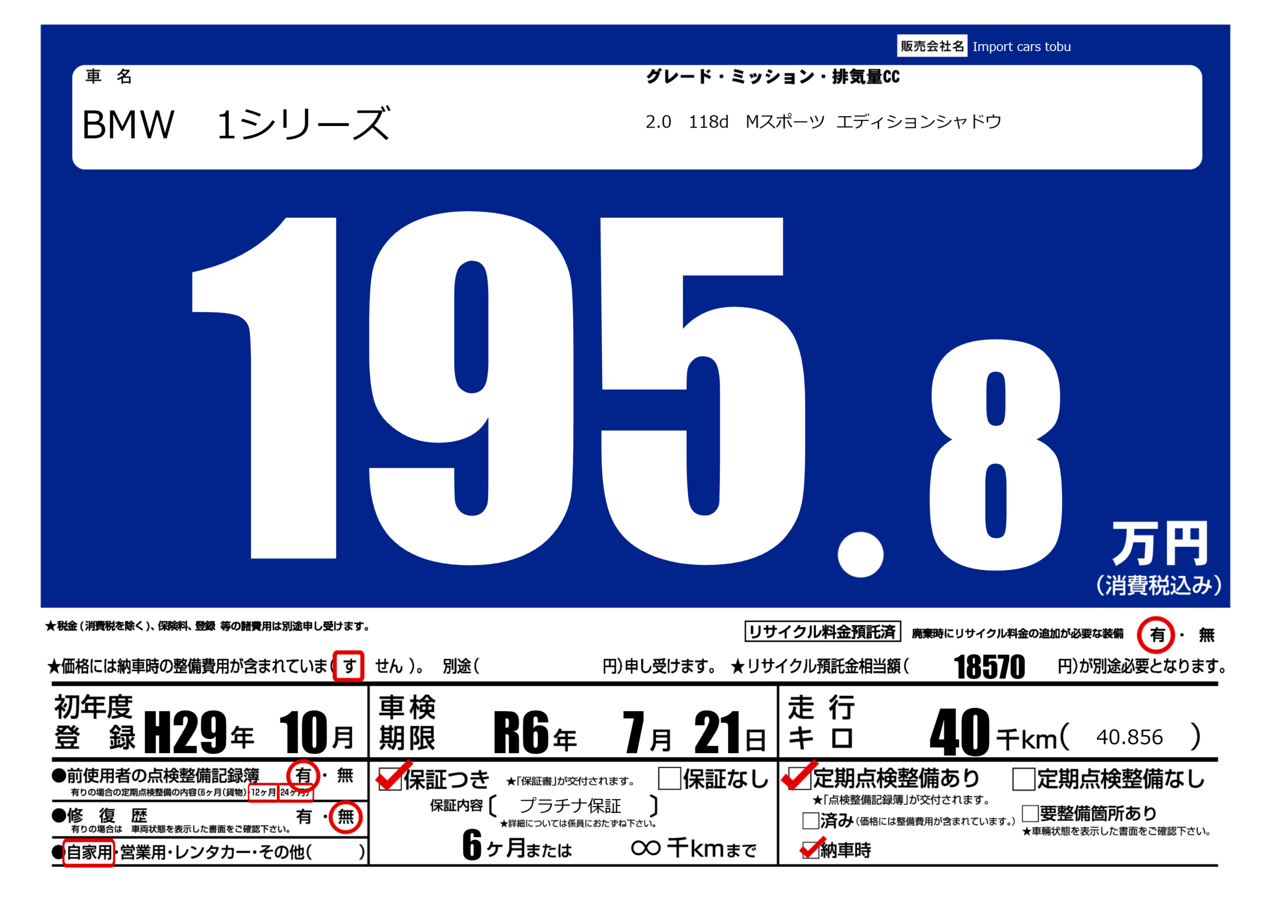 保証付き 保証内容( プラチナ保証) 6ヶ月または(∞)千kmまで |