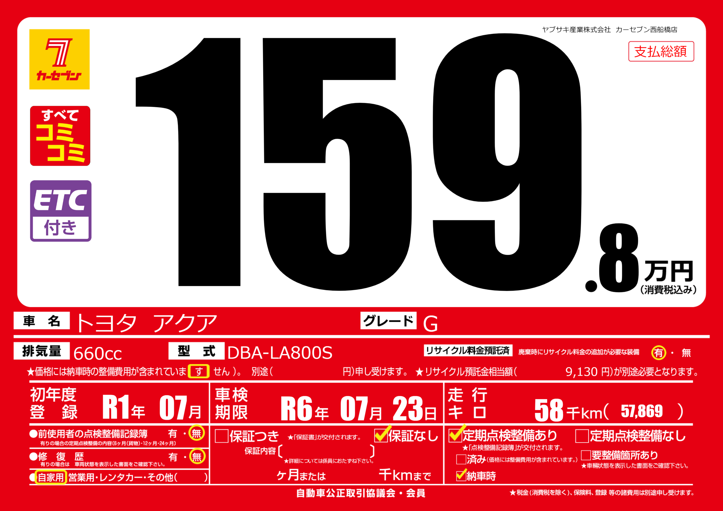| 定期点検整備 | 定期点検整備あり 納車時あり | ||