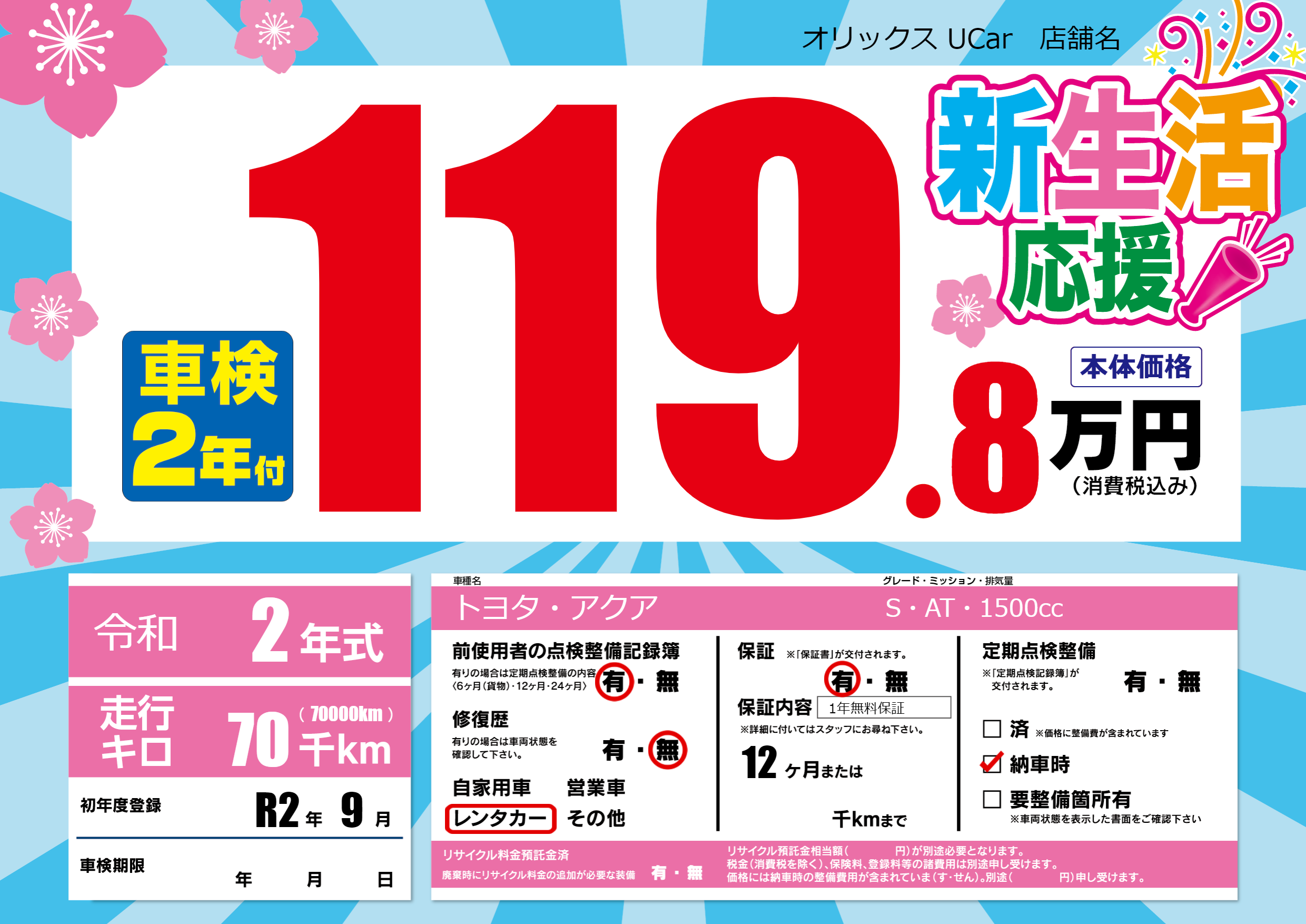 | 車名 | トヨタ・アクア | グレード ミッション 排気量 |