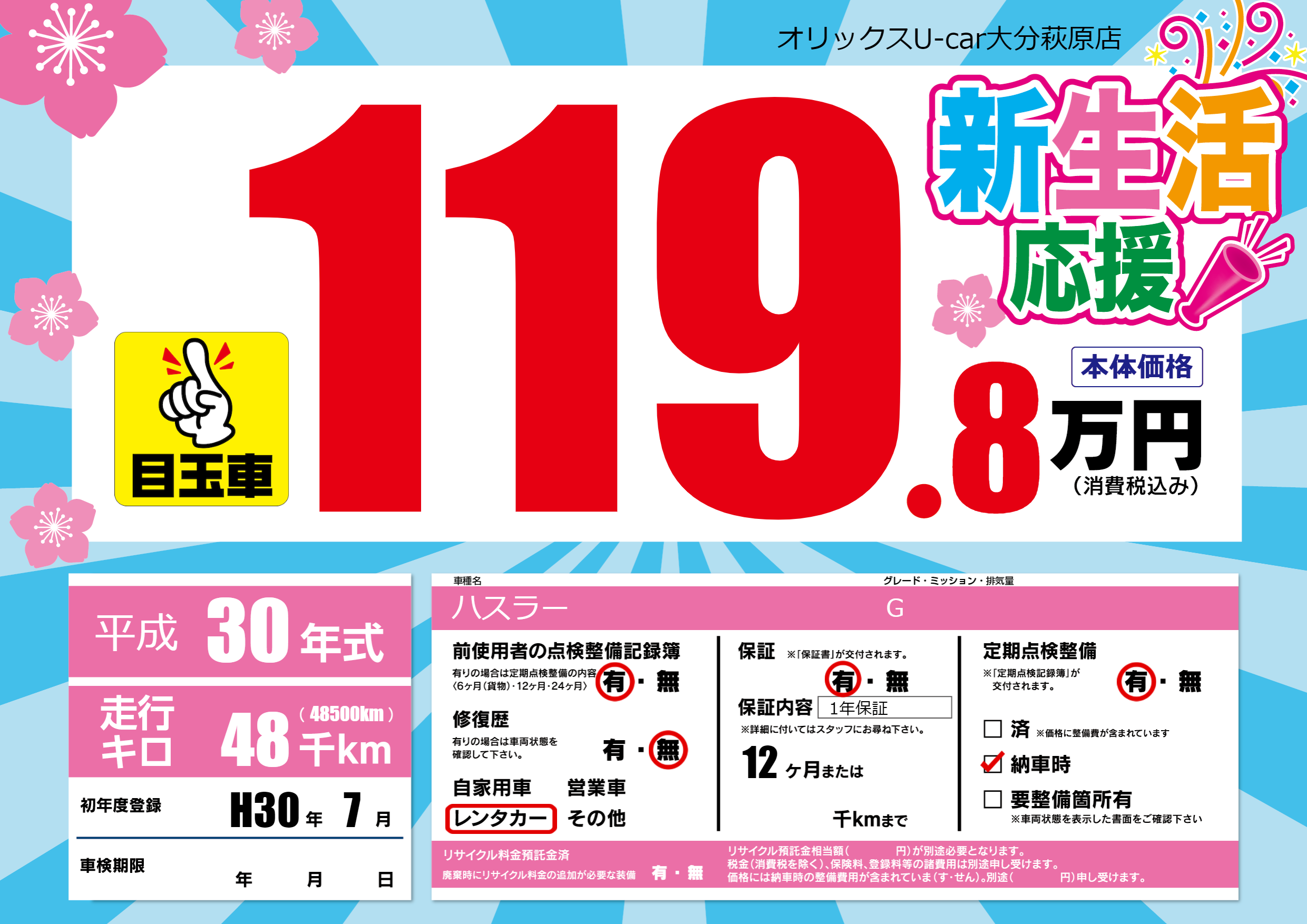 | 車名 | ハスラー | グレード ミッション 排気量 |
