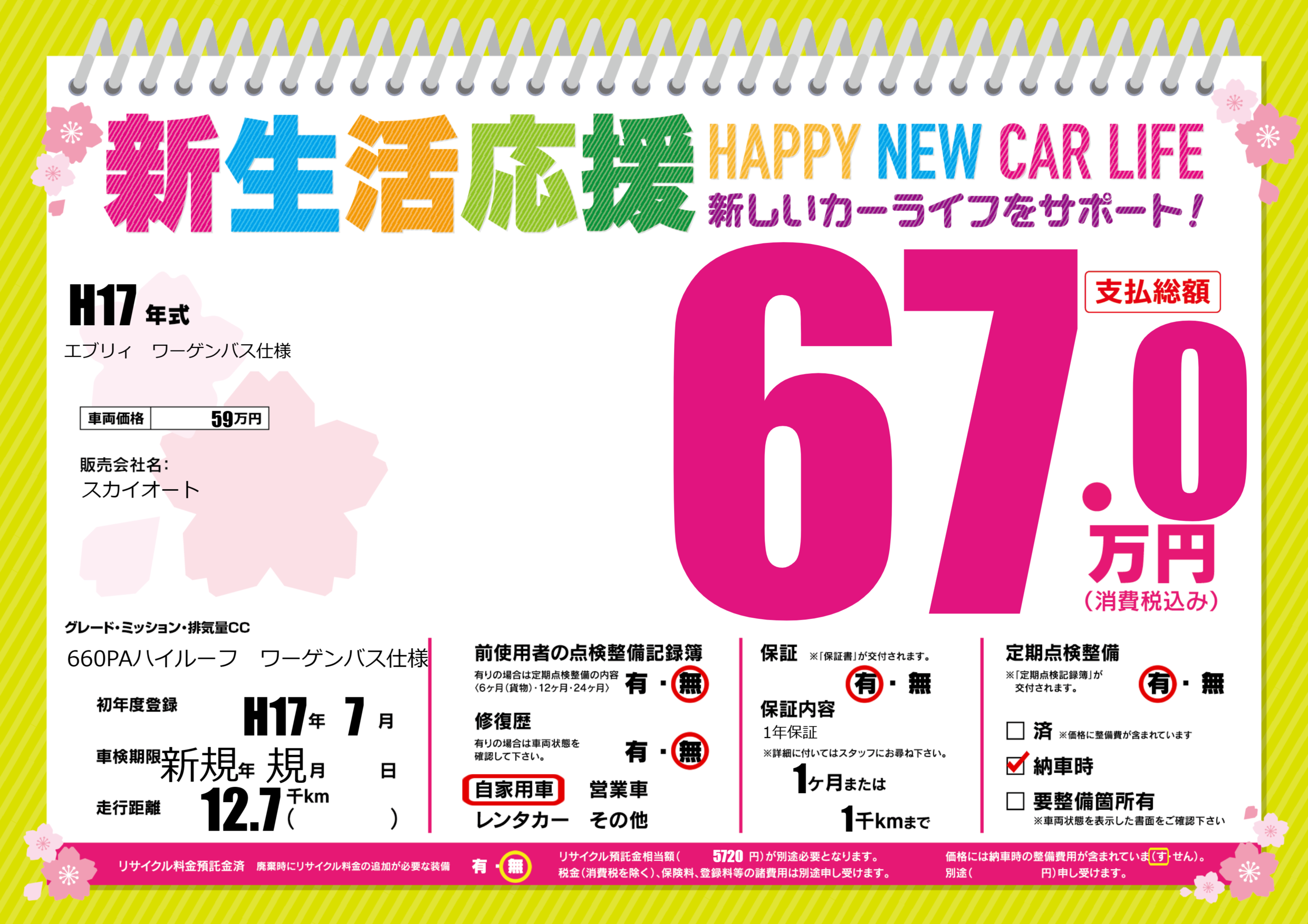 | 車名 | エブリィ ワーゲンバス仕様 | グレード ミッション 排気量 |