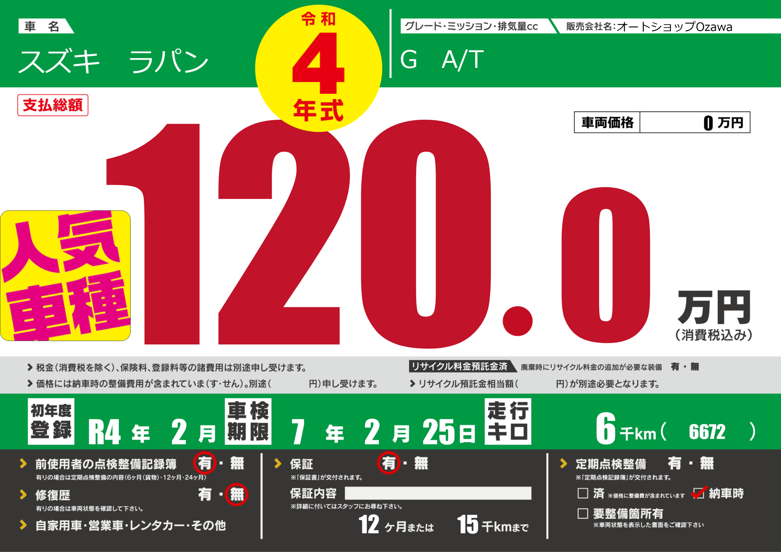 保証付き 保証内容(---) 12ヶ月または(15)千kmまで |