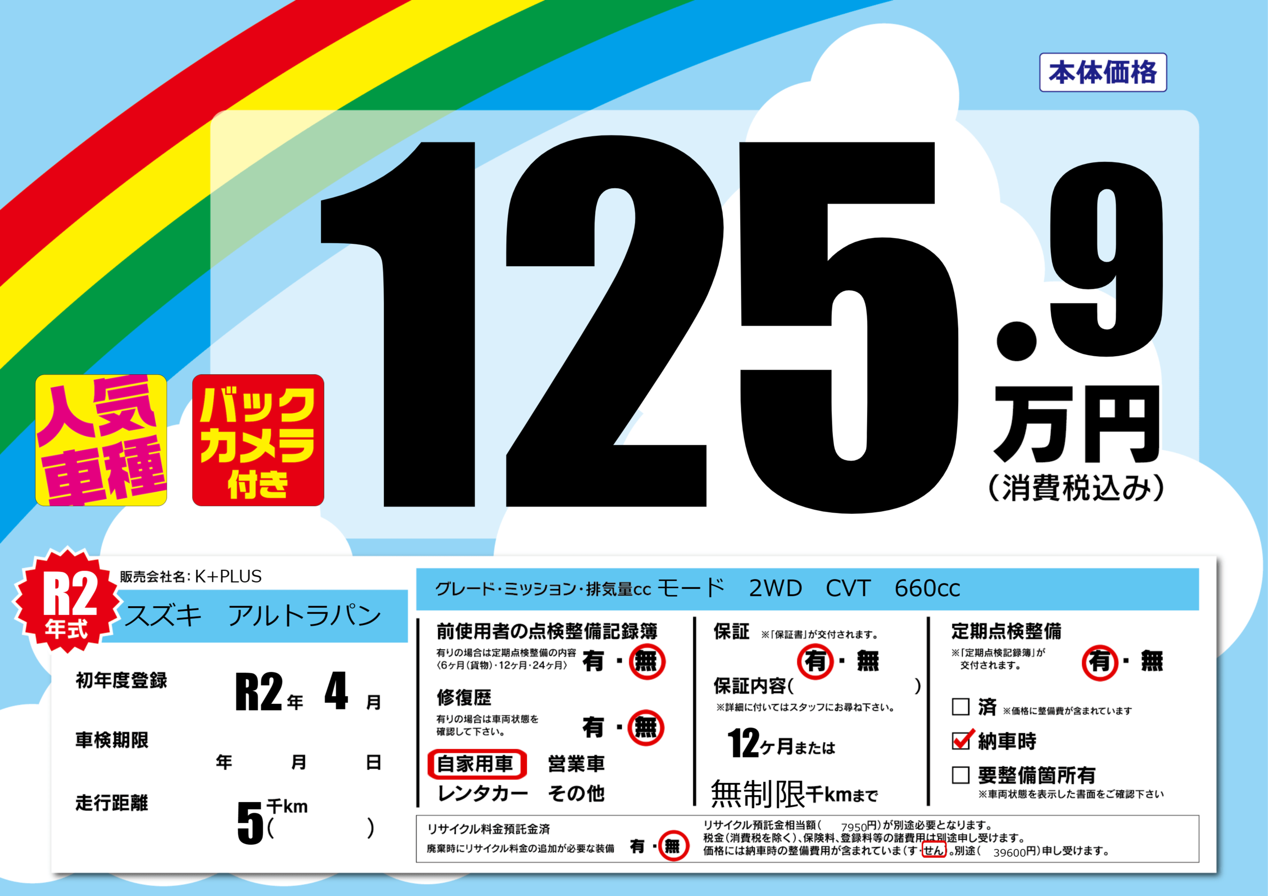 | 定期点検整備 | 定期点検整備あり 納車時あり | ||
