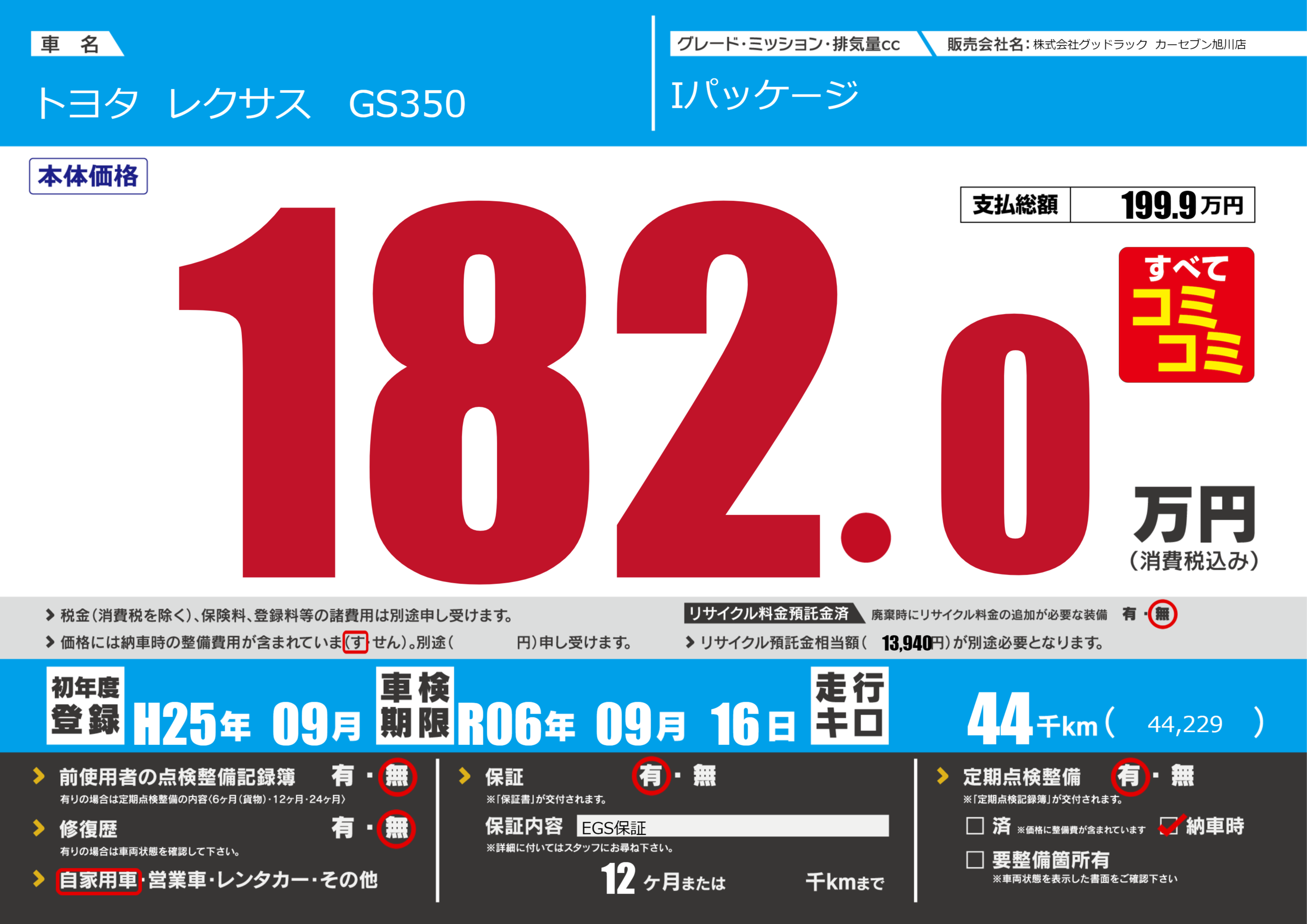 | 車名 | トヨタ レクサス GS350 | グレード ミッション 排気量 |