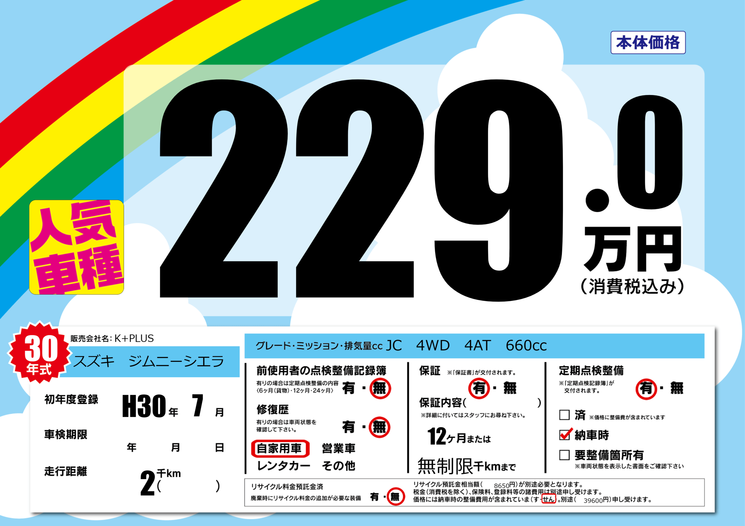 | 車名 | スズキ ジムニーシエラ | グレード ミッション 排気量 |