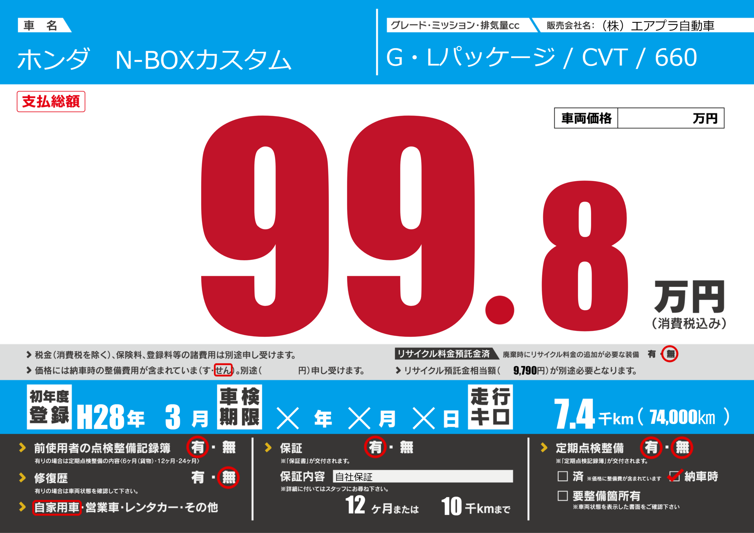 | 定期点検整備 | 定期点検整備あり 定期点検整備なし 納車時あり | ||