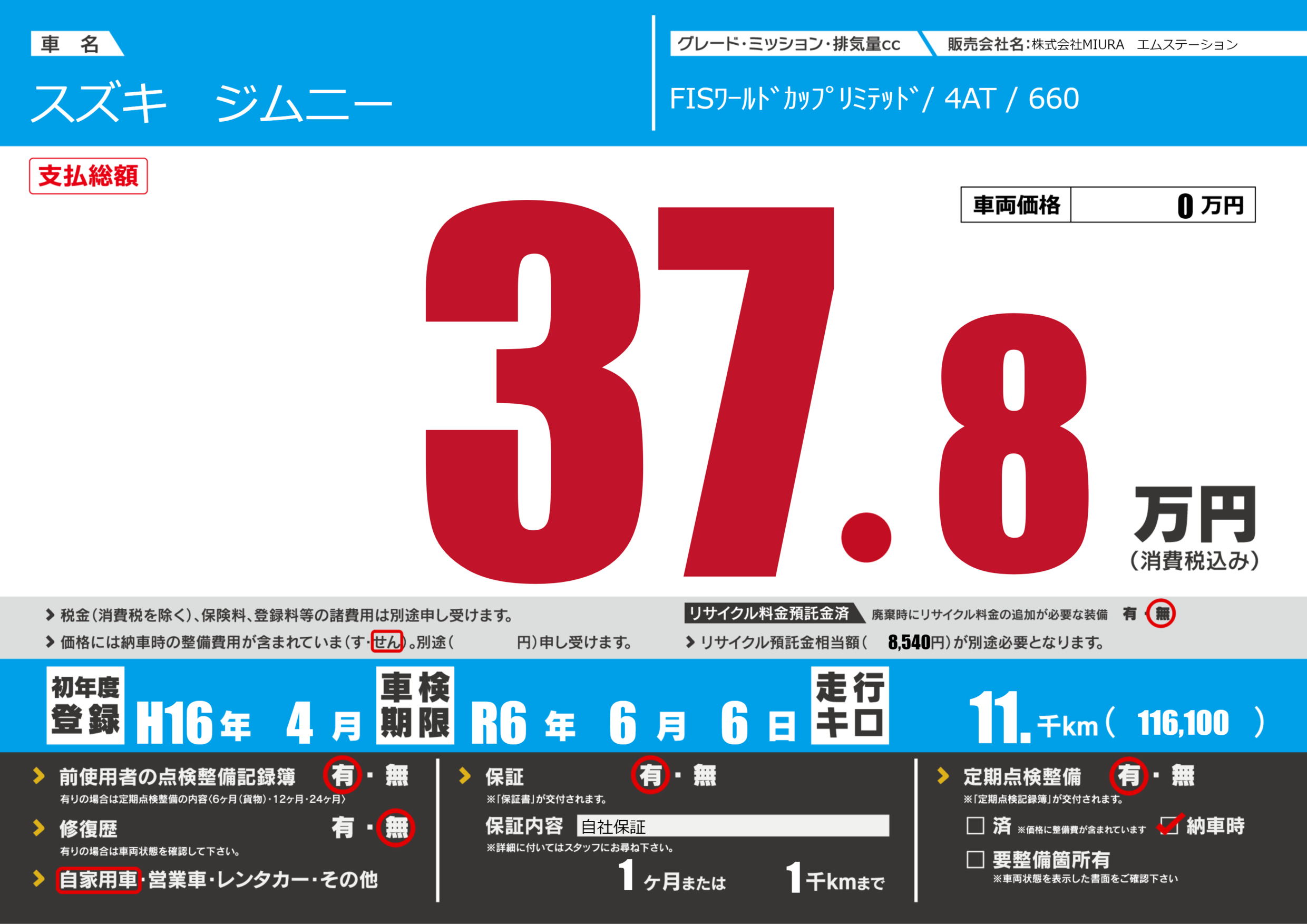 | 車名 | スズキ ジムニー | グレード ミッション 排気量 |