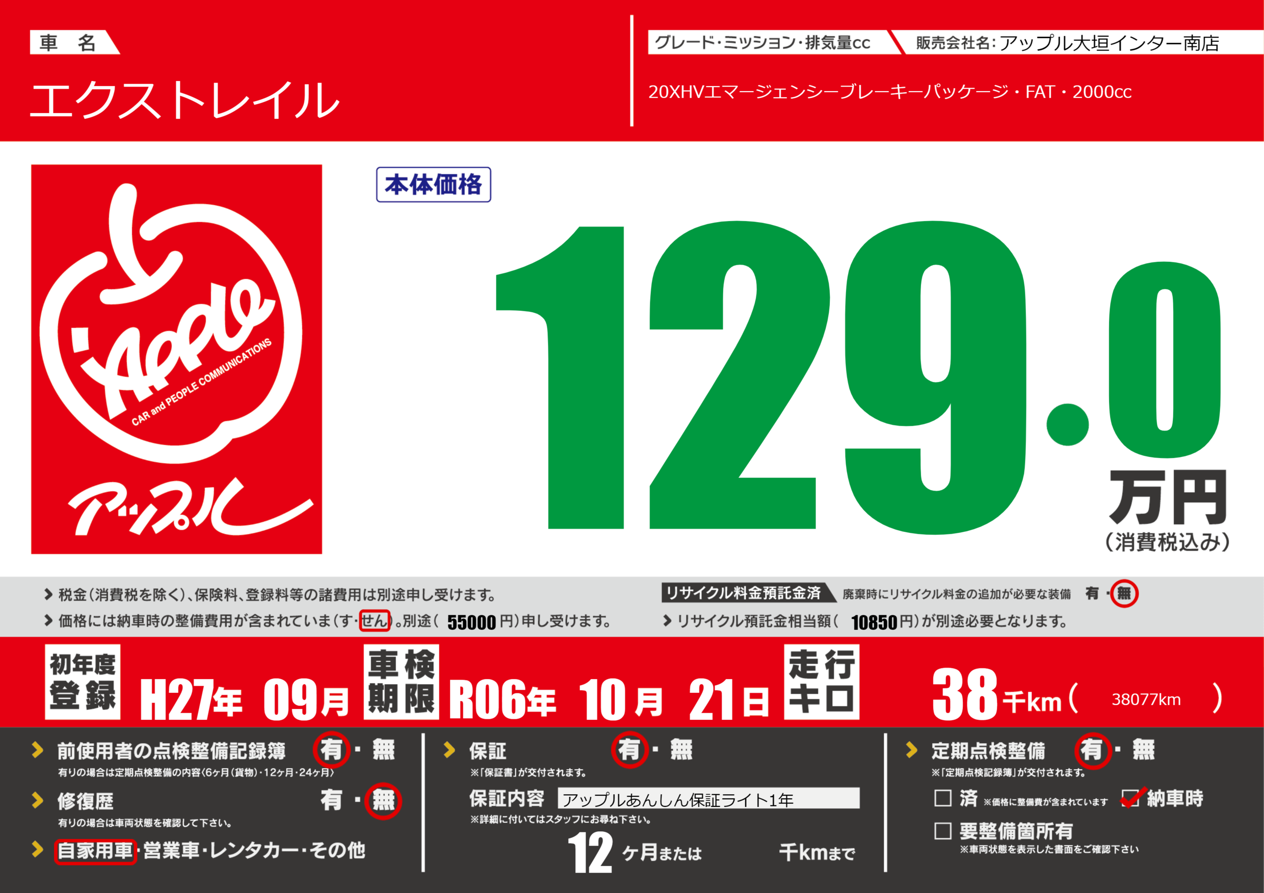 | 定期点検整備 | 定期点検整備あり 納車時あり | ||