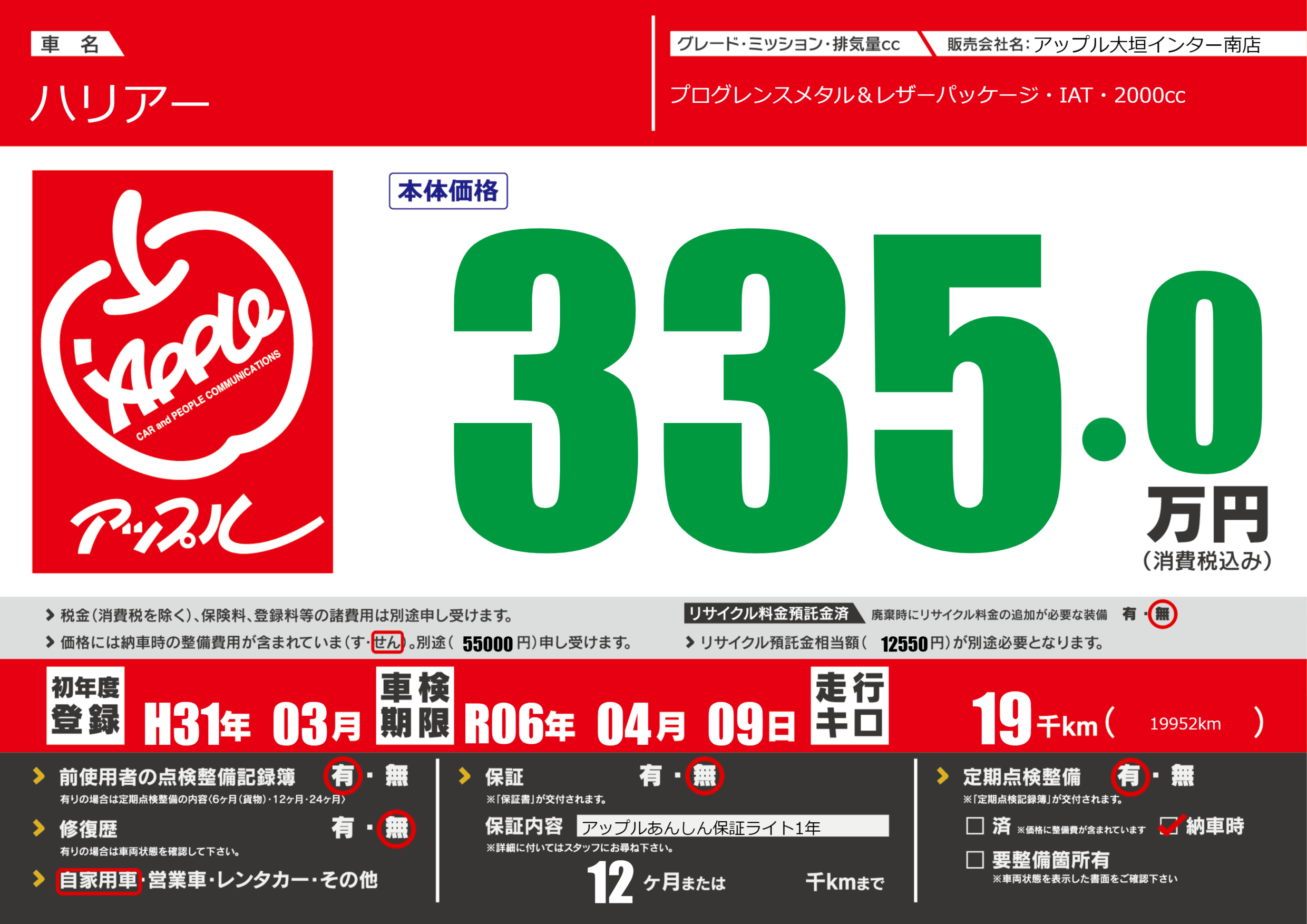 | 車名 | ハリアー | グレード ミッション 排気量 |