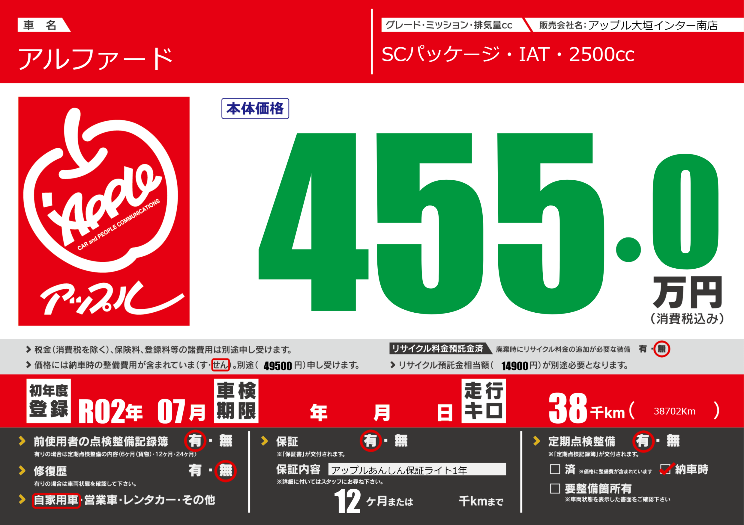 | 車名 | アルファード | グレード ミッション 排気量 |