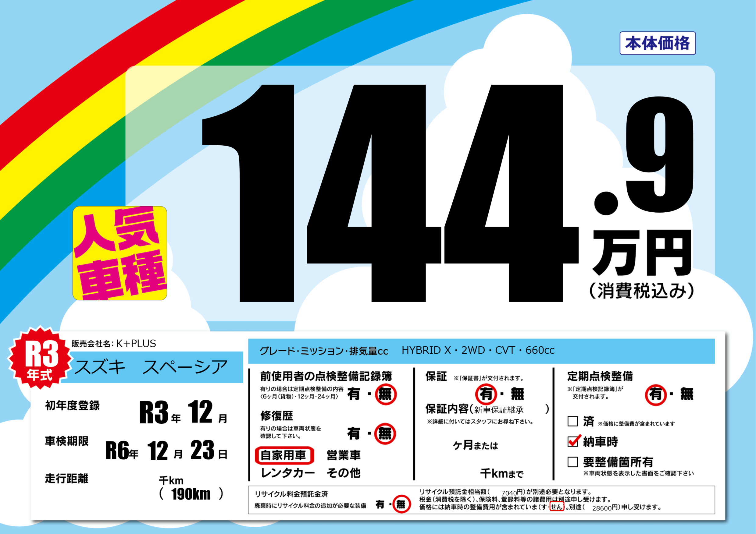 | 車名 | スズキ スペーシア | グレード ミッション 排気量 |
