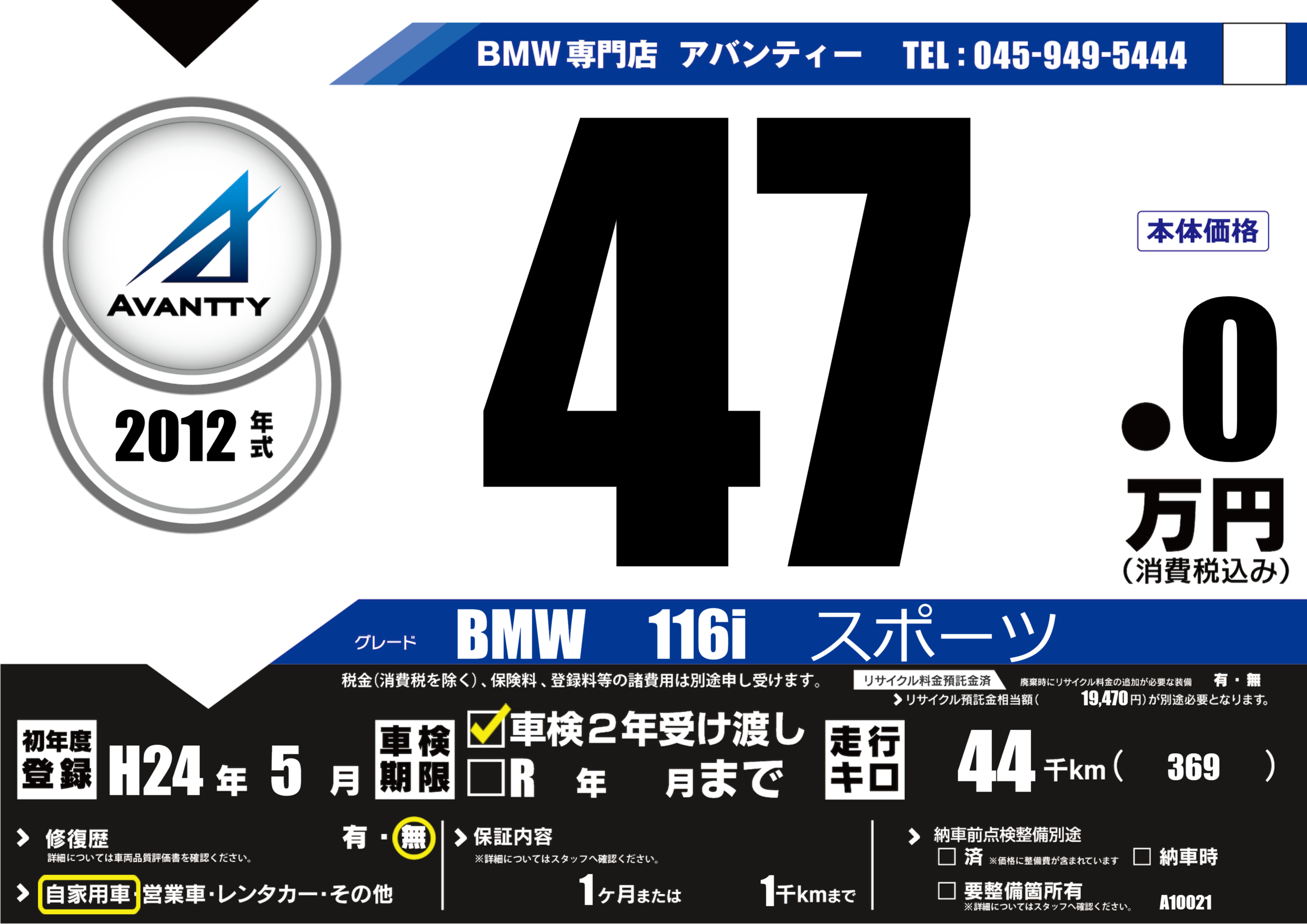 | 走行キロ | 4.4万km | 初年度登録 | H24年5月 |