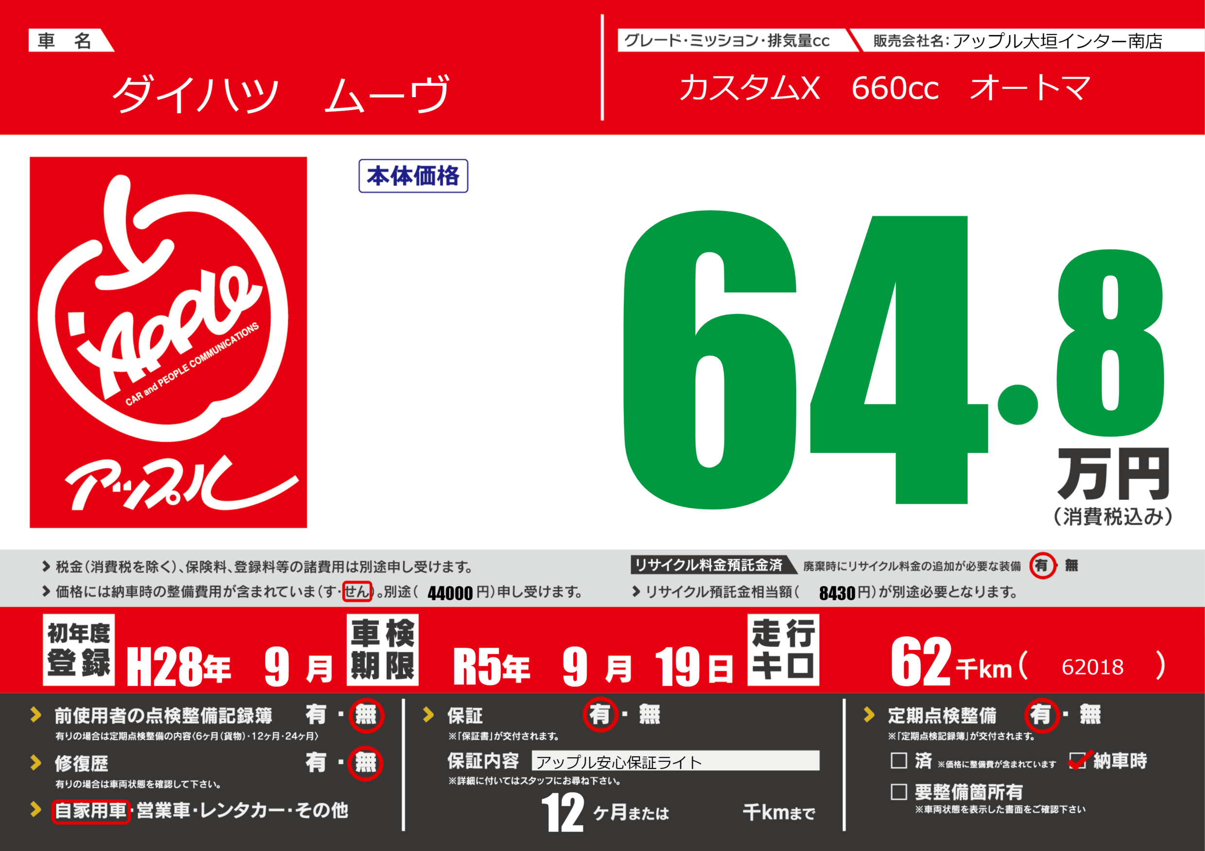 保証付き 保証内容(アップル安心保証ライト) 12ヶ月または()千kmまで |