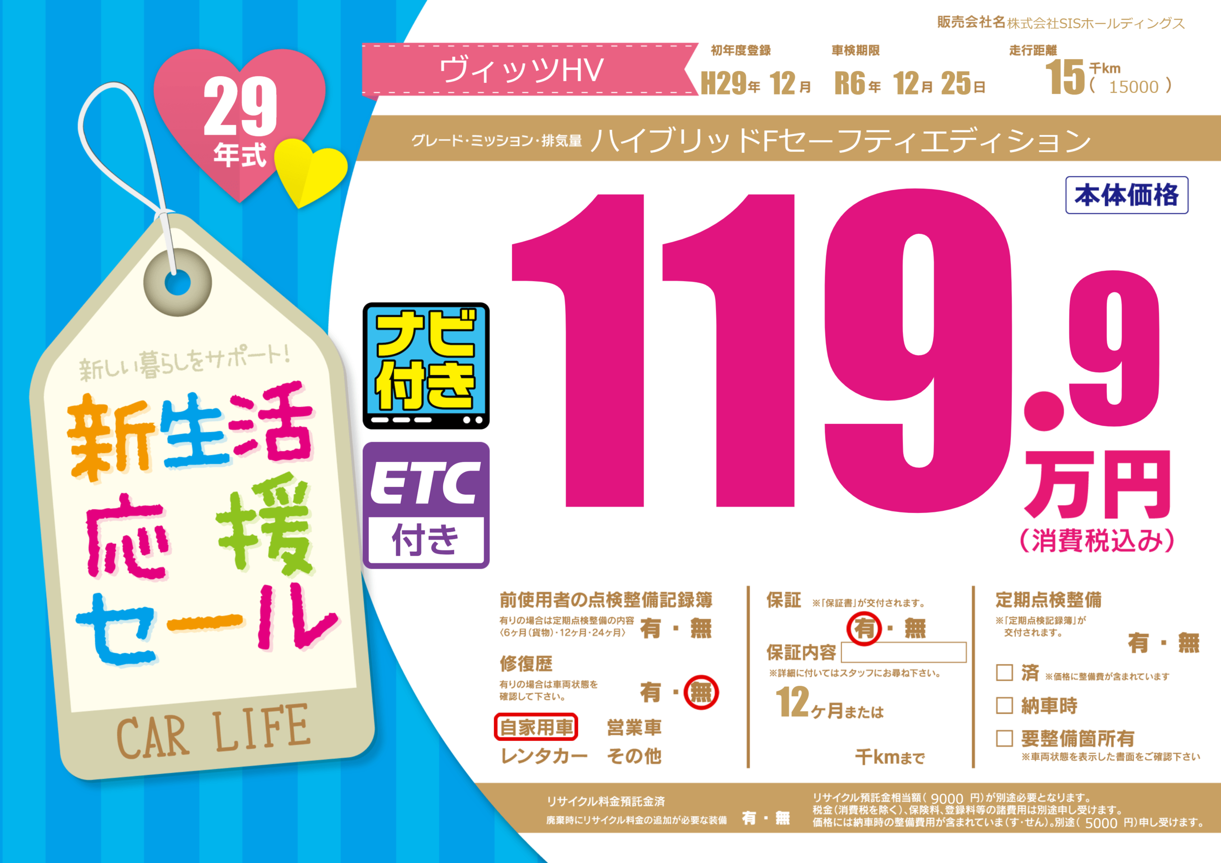 保証付き 保証内容(---) 12ヶ月または()千kmまで |