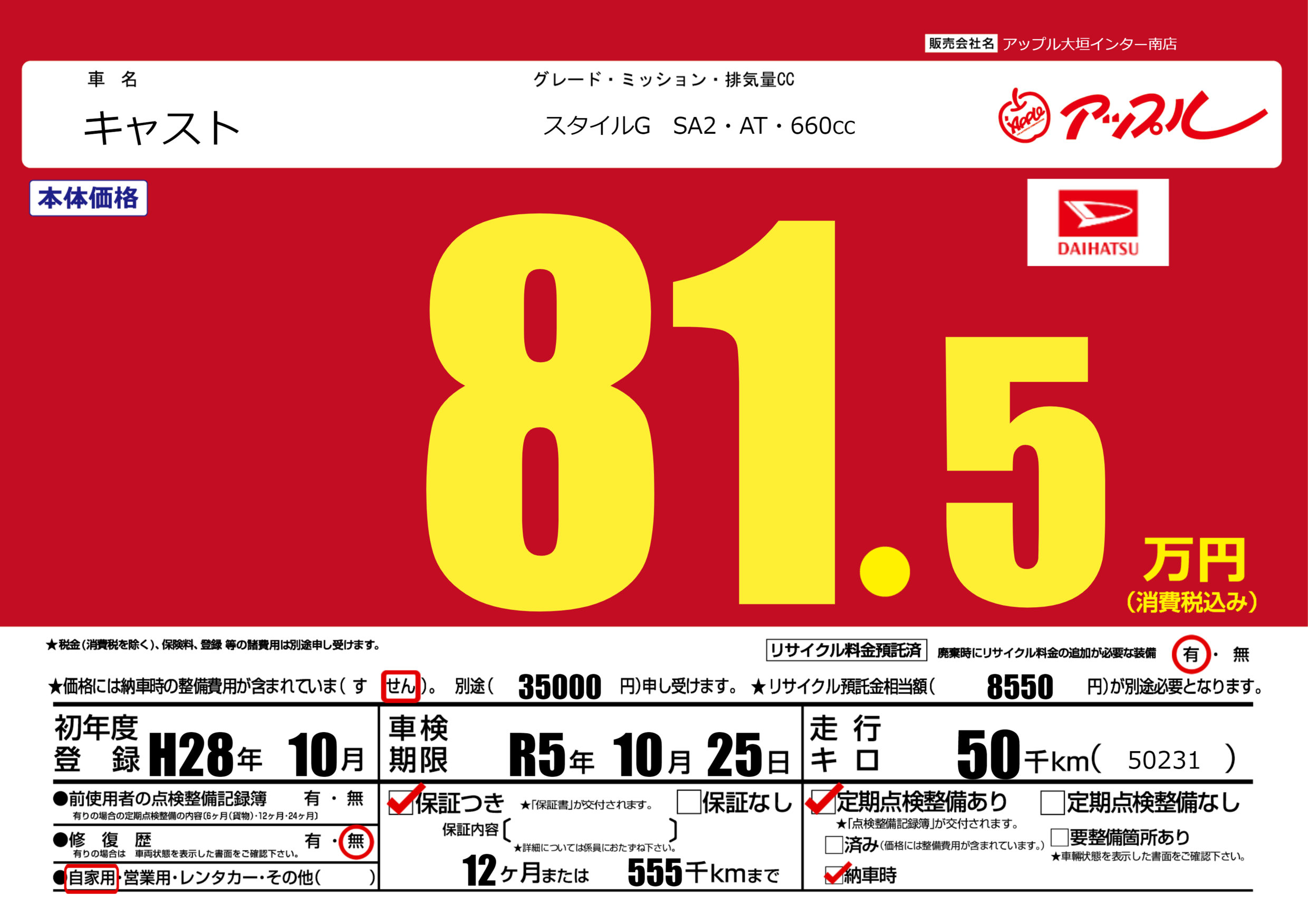 | 定期点検整備 | 定期点検整備あり 納車時あり | ||