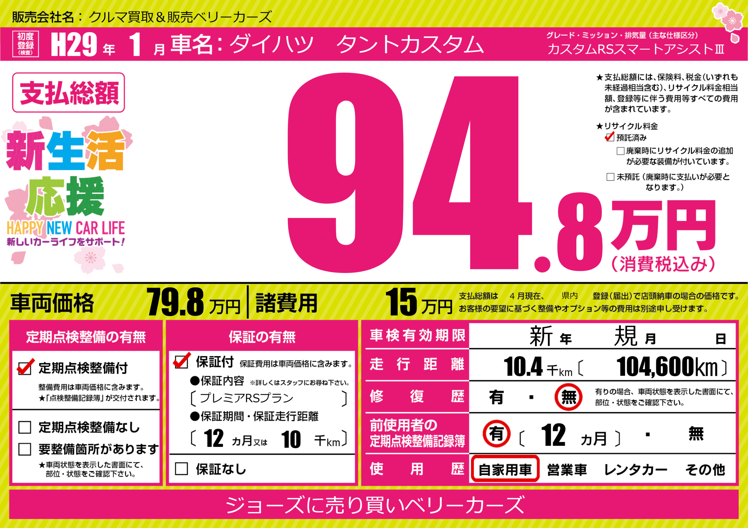 | 車名 | ダイハツ タントカスタム | グレード ミッション 排気量 |