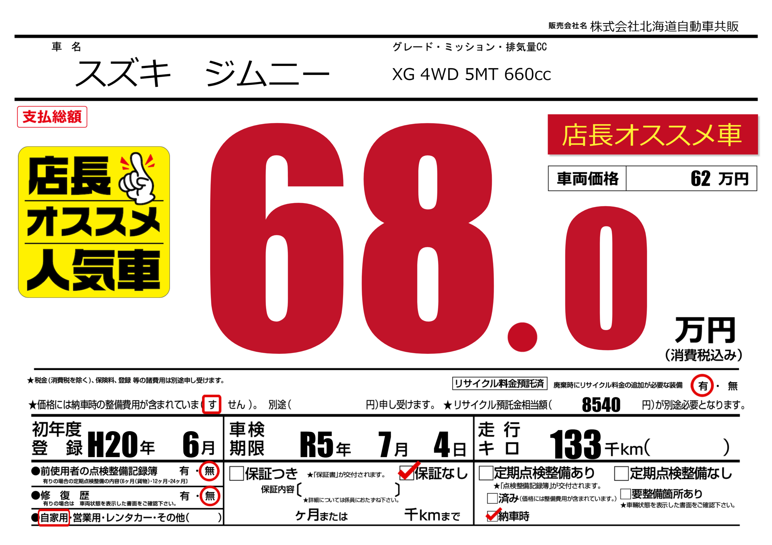 | 車名 | スズキ ジムニー | グレード ミッション 排気量 |
