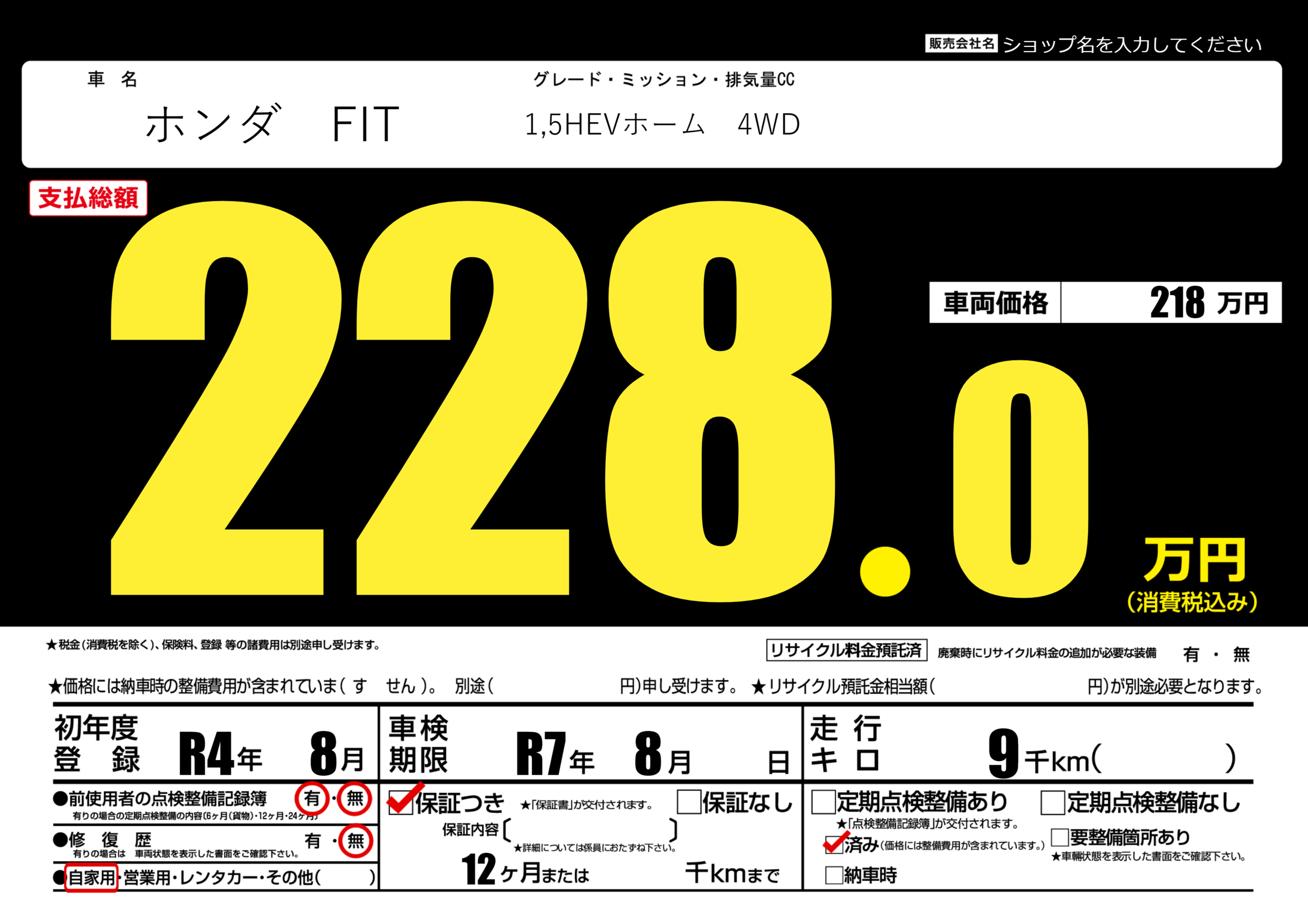 | 車検制限 | R7年 8月 - 日 | ||