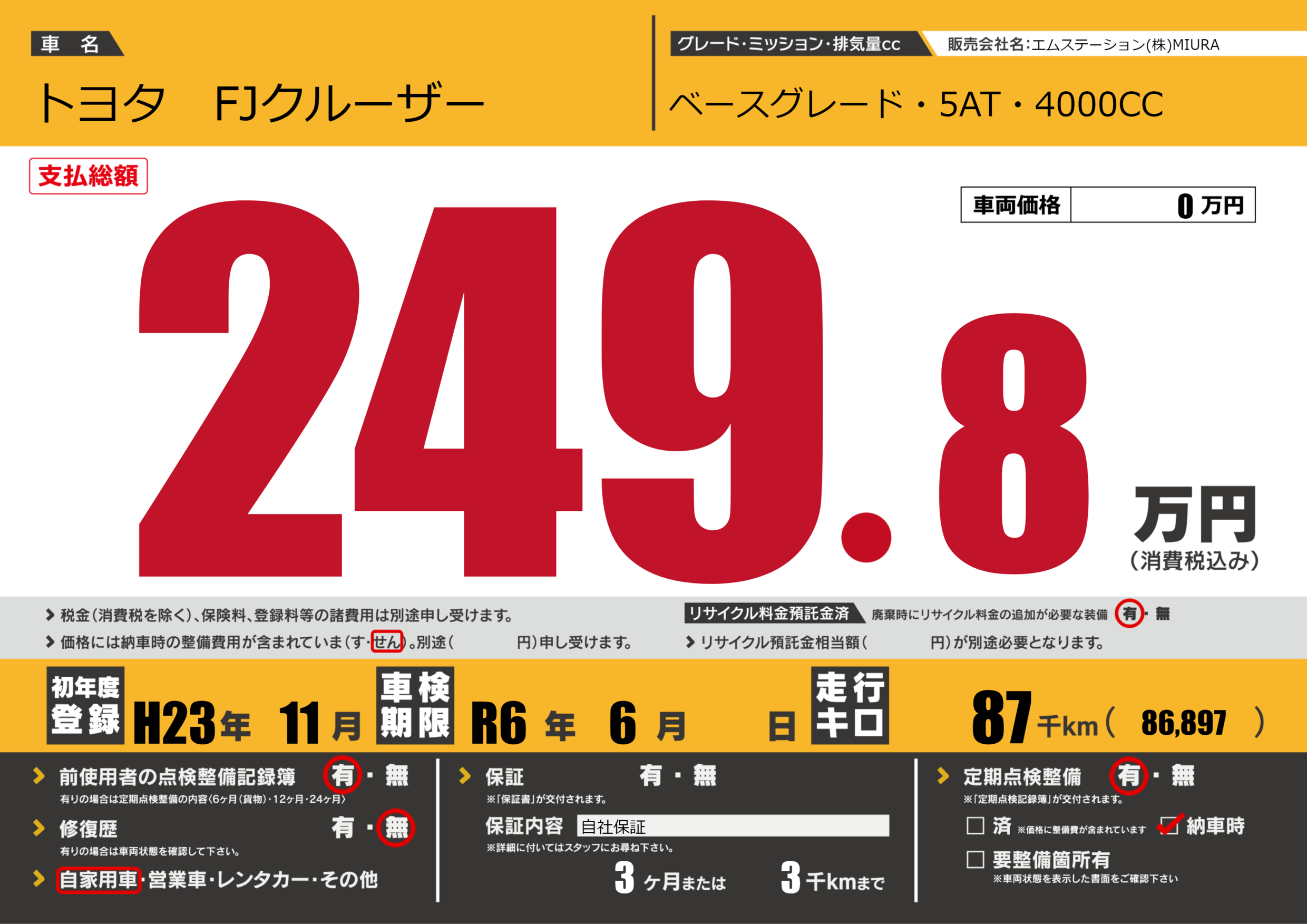 | 車名 | トヨタ FJクルーザー | グレード ミッション 排気量 |