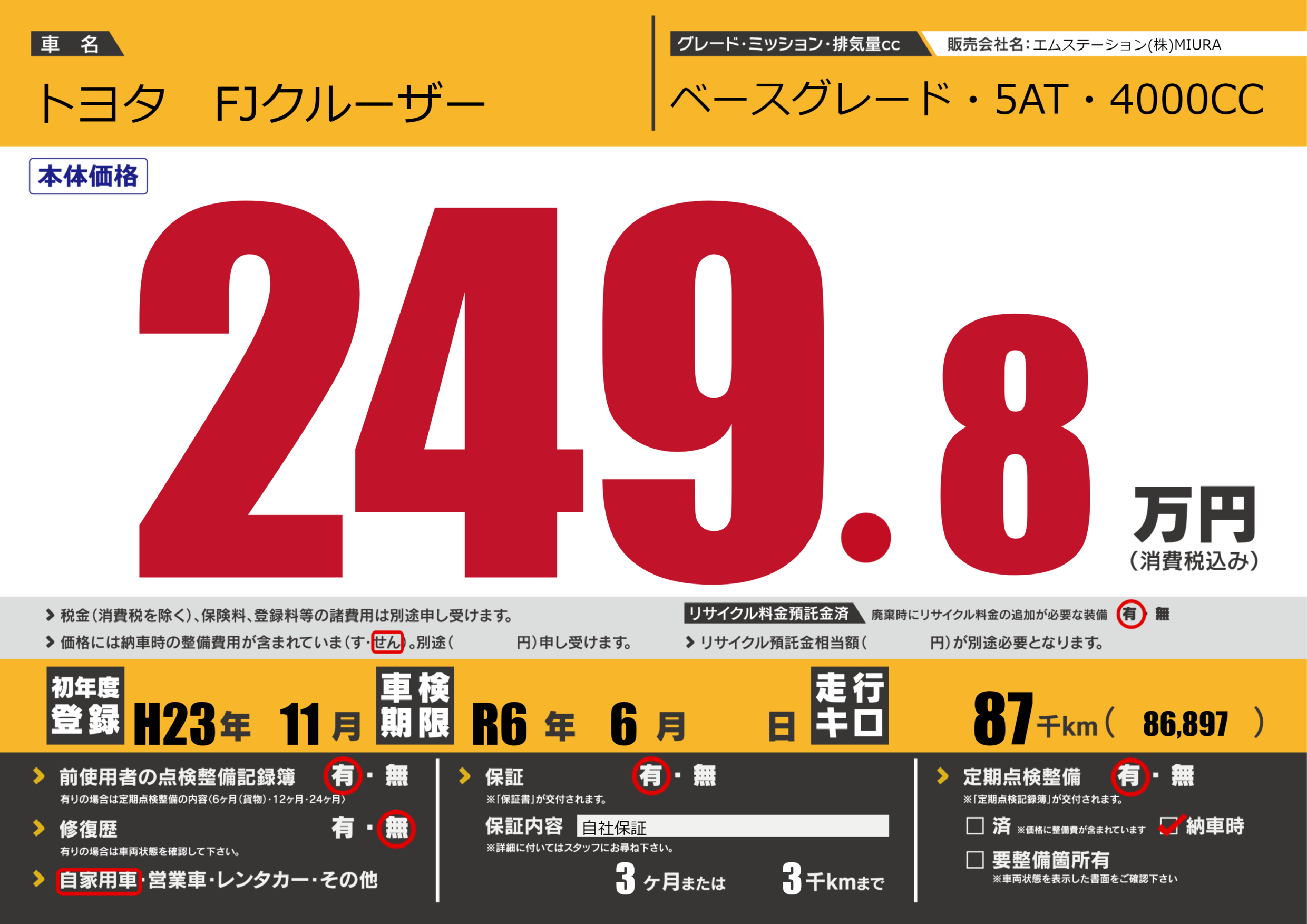 | 車名 | トヨタ FJクルーザー | グレード ミッション 排気量 |