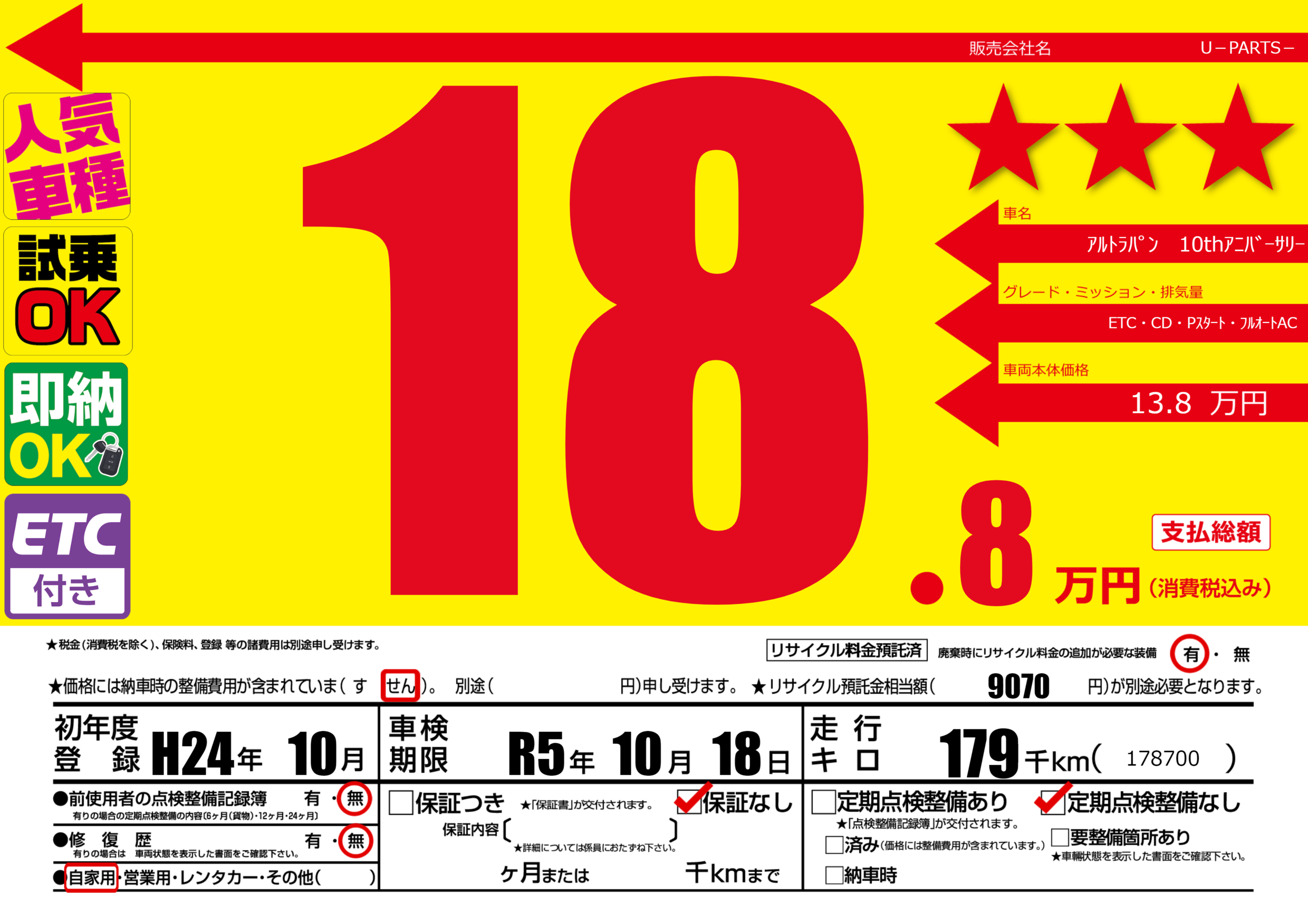 | 走行キロ | 17.9万km | 初年度登録 | H24年10月 |