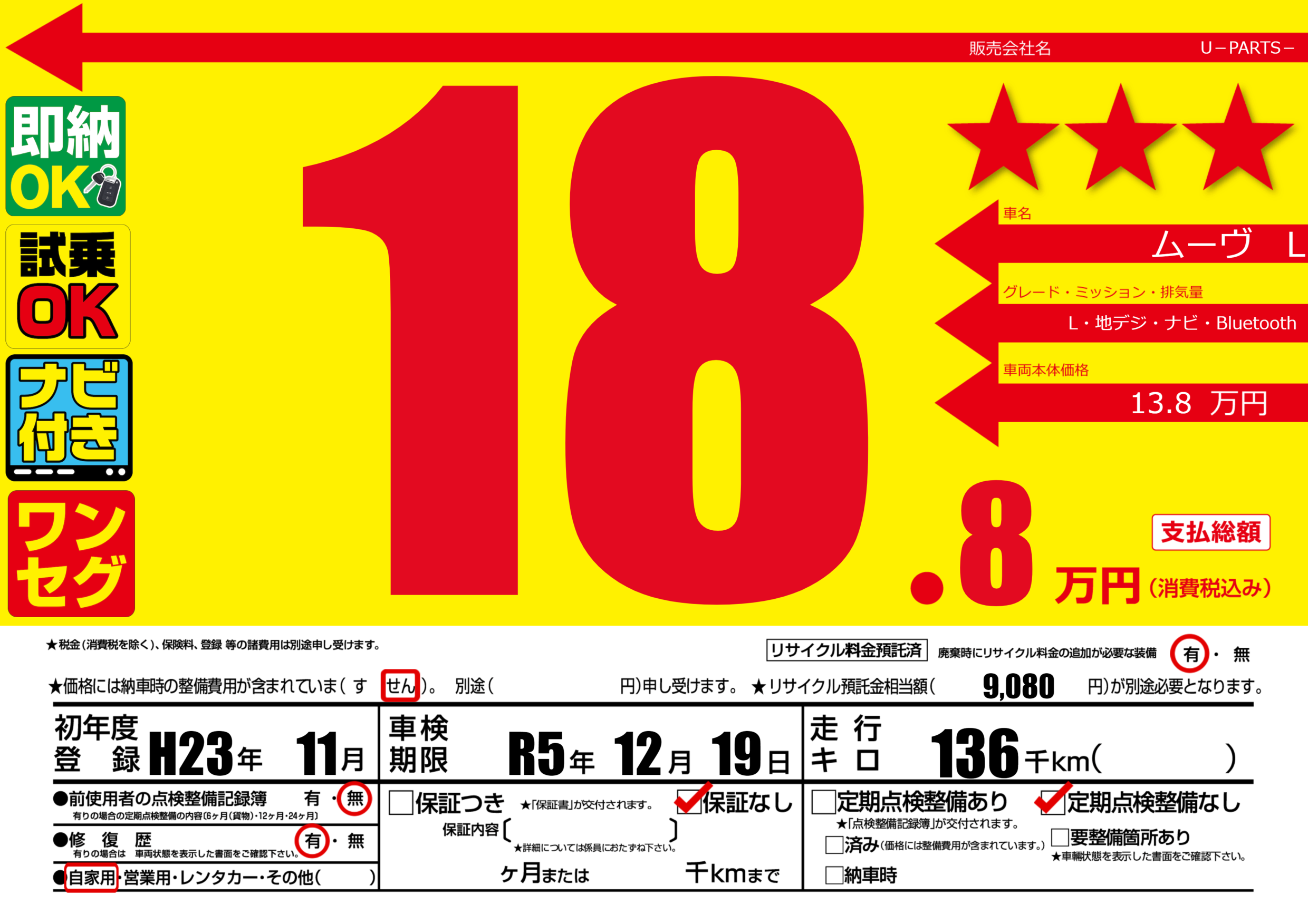 | 車名 | ムーヴ L | グレード ミッション 排気量 |
