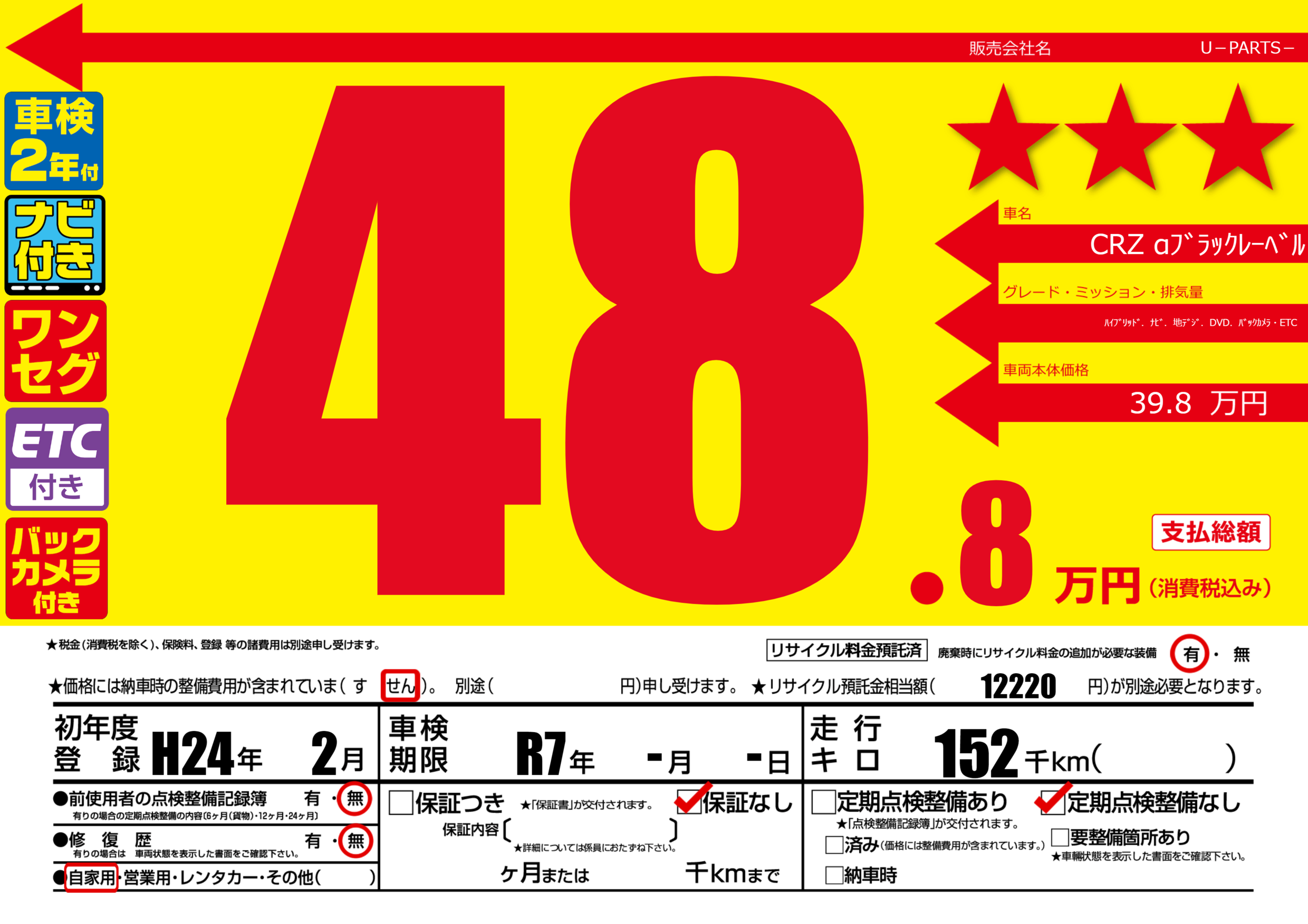 | 車名 | CRZ αブラックレーベル | グレード ミッション 排気量 |