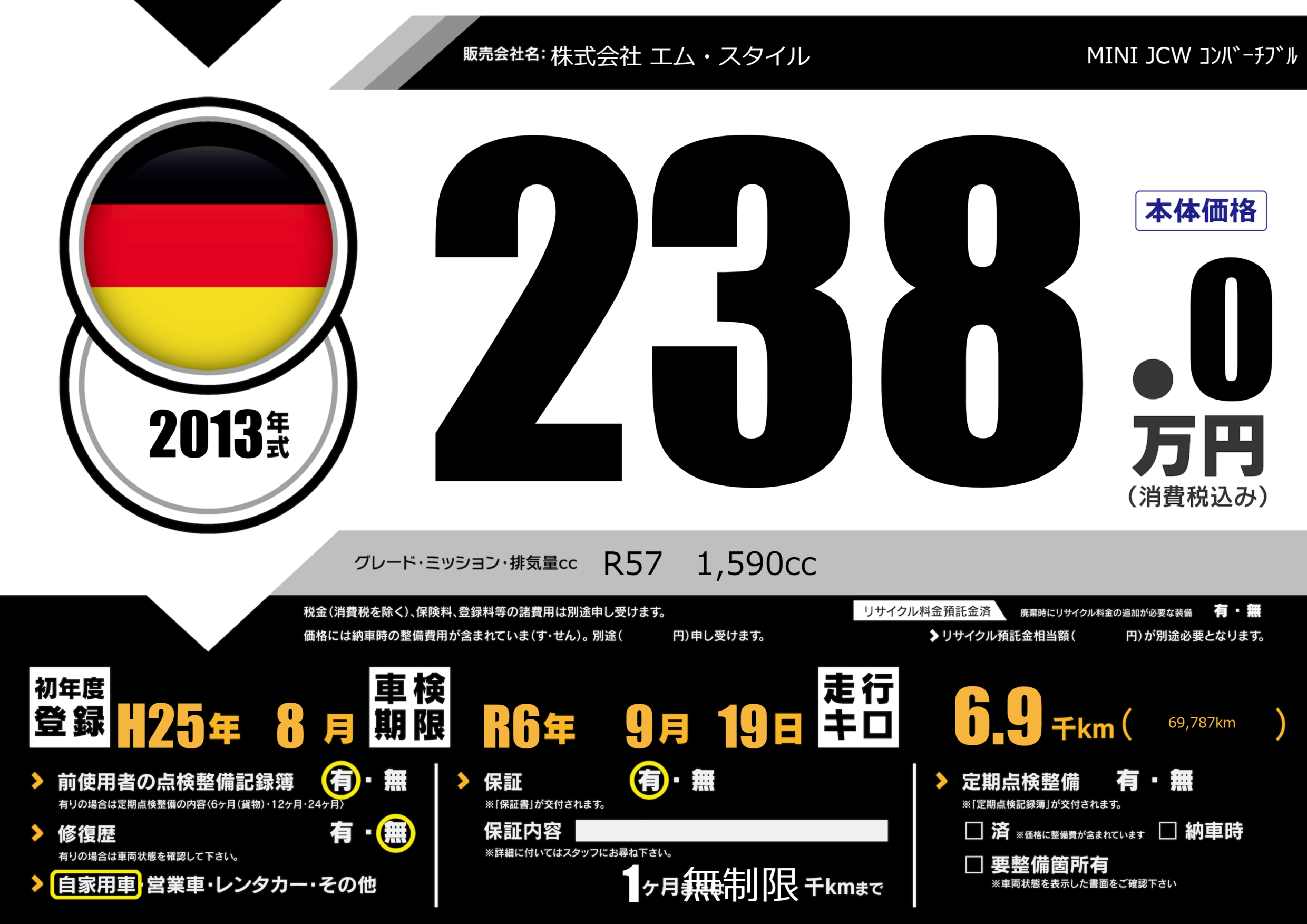 | 車名 | MINI JCW コンバーチブル | グレード ミッション 排気量 |