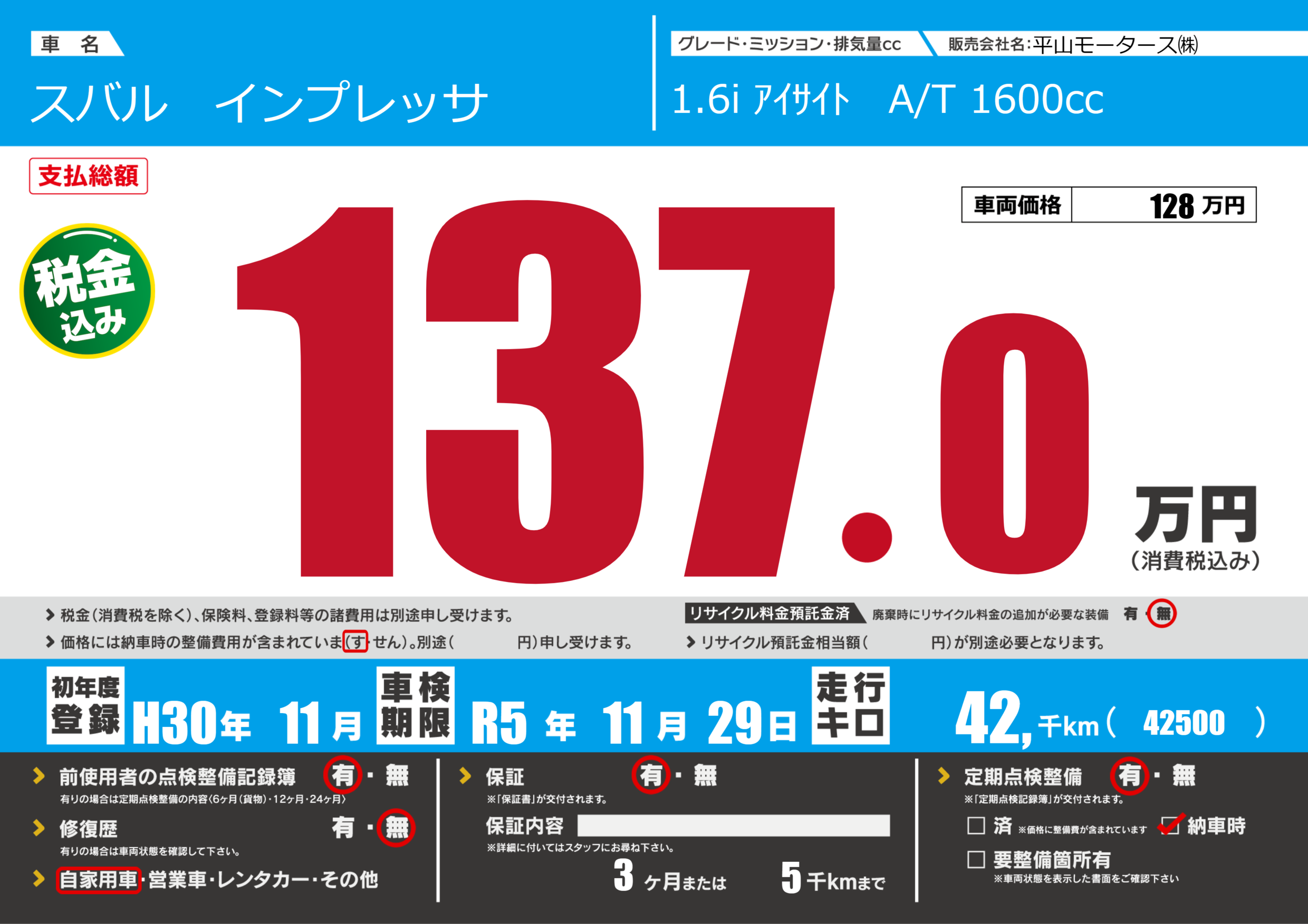 | 車名 | スバル インプレッサ | グレード ミッション 排気量 |