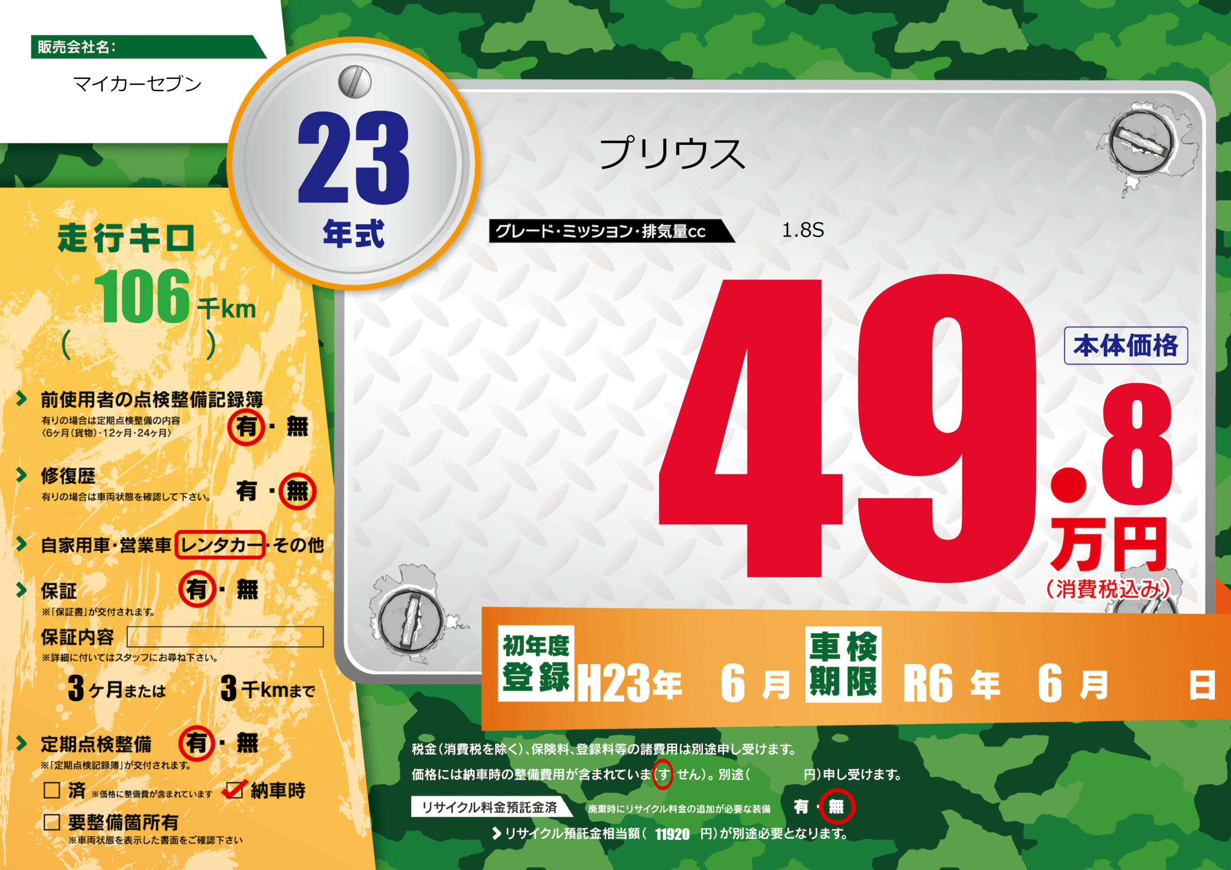 | 車名 | プリウス | グレード ミッション 排気量 |