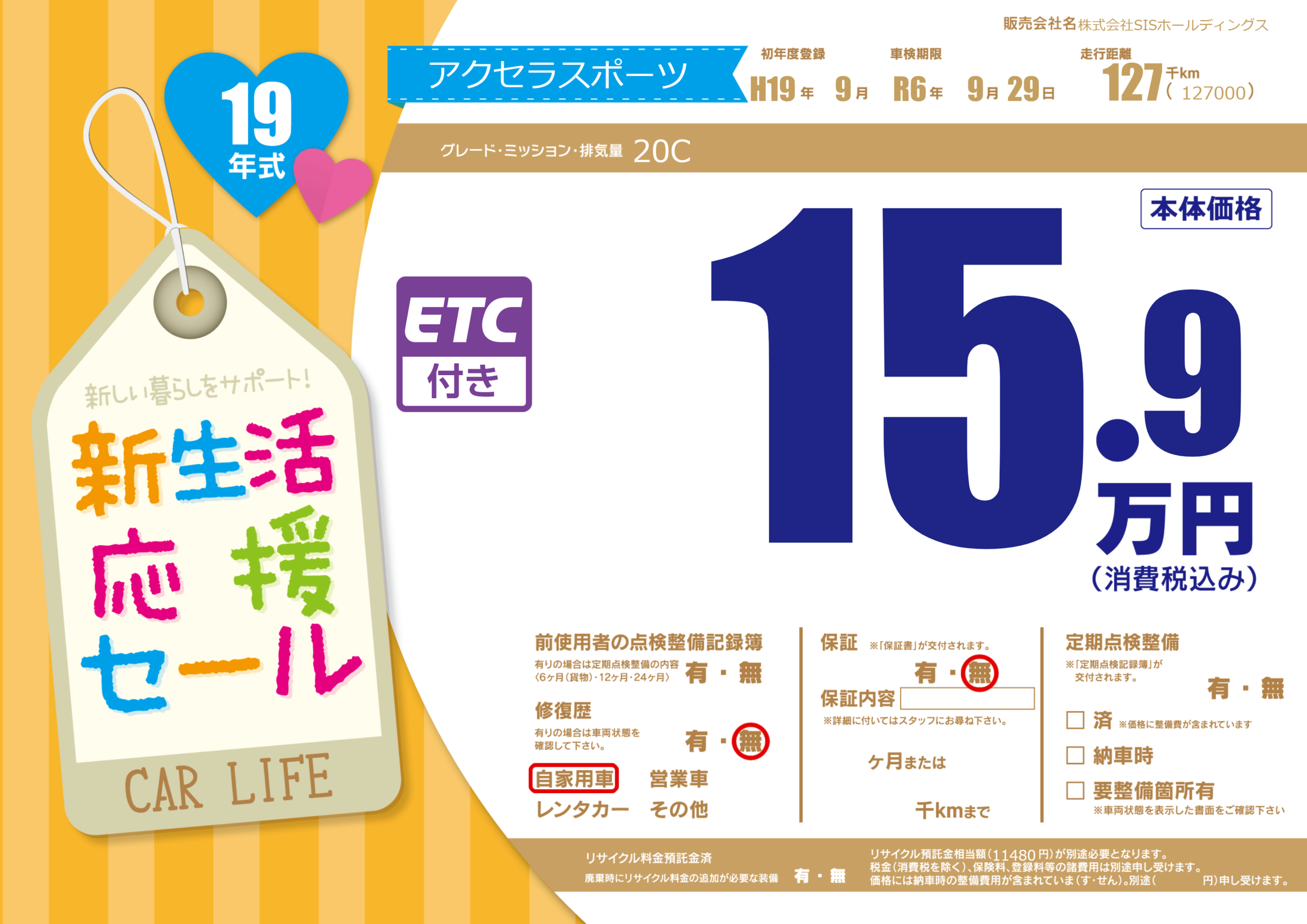 | 走行キロ | 12.7万km | 初年度登録 | H19年9月 |